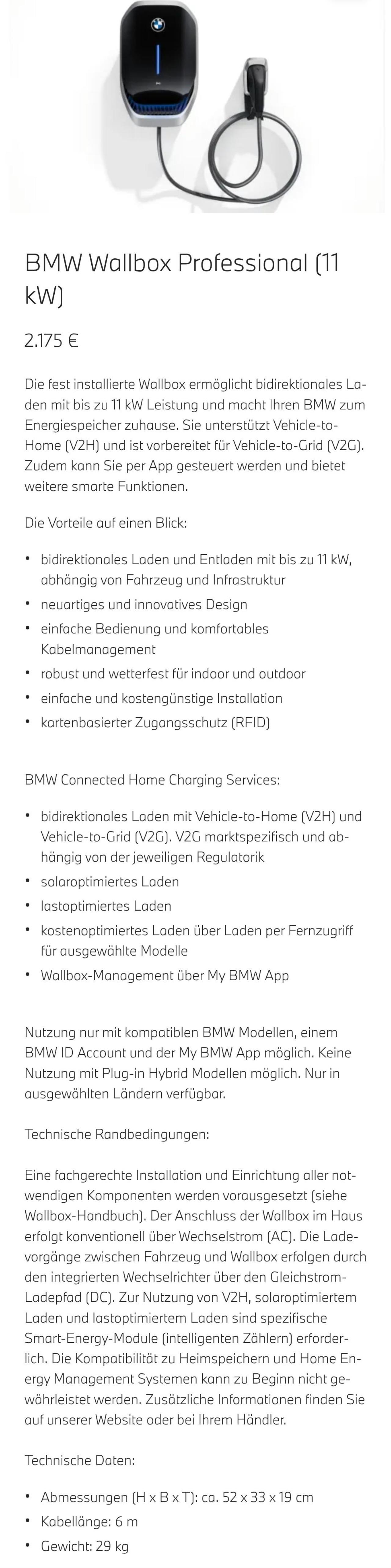 Das wird aber bei BMW nicht anders sein. Skoda bietet wie BMW eine eigene DC Wallbox an, der Unterschied ist, dass BMW sich erst gar nicht zu Drittherstellern geäußert hat. BMW macht es meiner Meinung nach schlauer: -Hardware, Software und Usecase (mit Energieanbieter) gleichzeitig präsentiert -preislich akzeptable Wallbox -(einfach) nachvollziehbarer wirtschaftlicher Vorteil Hier die Specs von der DC Wallbox ![]() |