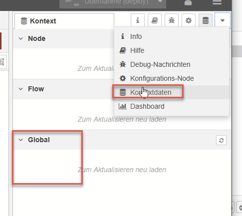 Um einen Wert in den Speicher zu legen nimmst du dieses Kommando: global.set("NameDesWertes",10); damit speichert du den Wert in den Kontextdaten unter "global" (geht mit node und flow äquivalent) Beispiel um einen Wert aus msg.payload zu speichern: global.set("CCL.AlterWert",msg.payload); mit Punkten kannst du mehrere Ebenen ansprechen z.b. CCL CCL.AlterWert CCL.AlterWert.Test CCL.AlterWert.Prod etc. um genau diesen Wert wieder auszulesen nimmst du dann z.B.: msg.payload = global.get("CCL.AlterWert"); ich hoffe das ist so logisch umzusetzen wie es für mich zu schreiben ist 😌 |