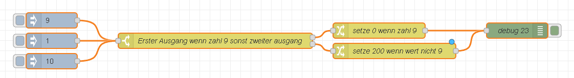 [ { "id": "be4ee0e1a9a64797", "type": "inject", "z": "127c36459fe4709f", "name": "", "props": [ { "p": "payload" }, { "p": "topic", "vt": "str" } ], "repeat": "", "crontab": "", "once": false, "onceDelay": 0.1, "topic": "", "payload": "9", "payloadType": "num", "x": 150, "y": 1760, "wires": [ [ "d61dcbc6f05ee641" ] ] }, { "id": "d61dcbc6f05ee641", "type": "switch", "z": "127c36459fe4709f", "name": "Erster Ausgang wenn zahl 9 sonst zweiter ausgang", "property": "payload", "propertyType": "msg", "rules": [ { "t": "eq", "v": "9", "vt": "num" }, { "t": "else" } ], "checkall": "true", "repair": false, "outputs": 2, "x": 470, "y": 1800, "wires": [ [ "1f14eea098e98ff5" ], [ "1d01d3e025d23d58" ] ] }, { "id": "fcfbc9f695dff9ba", "type": "inject", "z": "127c36459fe4709f", "name": "", "props": [ { "p": "payload" }, { "p": "topic", "vt": "str" } ], "repeat": "", "crontab": "", "once": false, "onceDelay": 0.1, "topic": "", "payload": "1", "payloadType": "num", "x": 150, "y": 1800, "wires": [ [ "d61dcbc6f05ee641" ] ] }, { "id": "6d3b0a99543822e1", "type": "inject", "z": "127c36459fe4709f", "name": "", "props": [ { "p": "payload" }, { "p": "topic", "vt": "str" } ], "repeat": "", "crontab": "", "once": false, "onceDelay": 0.1, "topic": "", "payload": "10", "payloadType": "num", "x": 150, "y": 1840, "wires": [ [ "d61dcbc6f05ee641" ] ] }, { "id": "1f14eea098e98ff5", "type": "change", "z": "127c36459fe4709f", "name": "setze 0 wenn zahl 9", "rules": [ { "t": "set", "p": "payload", "pt": "msg", "to": "0", "tot": "num" } ], "action": "", "property": "", "from": "", "to": "", "reg": false, "x": 790, "y": 1780, "wires": [ [ "5236ef2473f8d3e4" ] ] }, { "id": "1d01d3e025d23d58", "type": "change", "z": "127c36459fe4709f", "name": "setze 200 wenn wert nicht 9", "rules": [ { "t": "set", "p": "payload", "pt": "msg", "to": "200", "tot": "num" } ], "action": "", "property": "", "from": "", "to": "", "reg": false, "x": 820, "y": 1820, "wires": [ [ "5236ef2473f8d3e4" ] ] }, { "id": "5236ef2473f8d3e4", "type": "debug", "z": "127c36459fe4709f", "name": "debug 23", "active": true, "tosidebar": true, "console": false, &n |