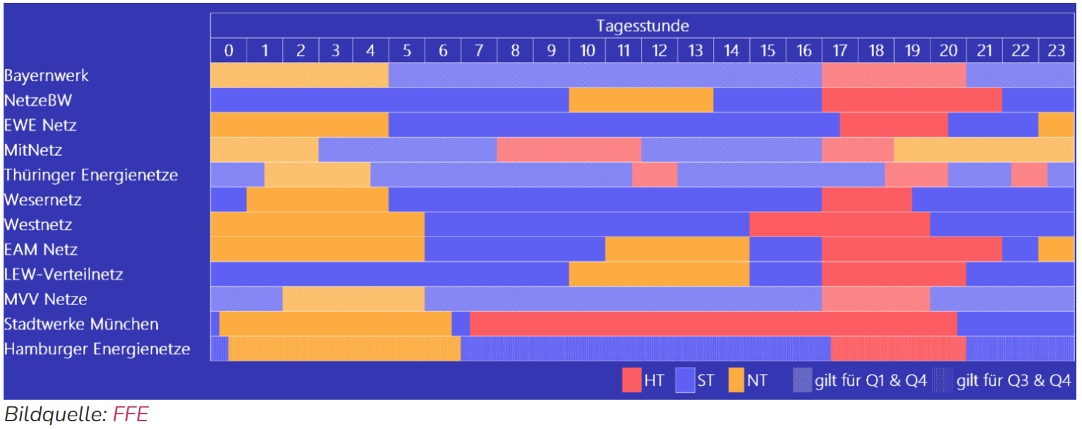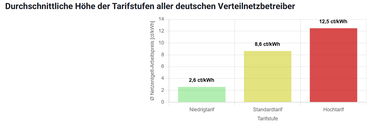 Deutschland hat ja für steuerbare Lasten wie WP WP [Wärmepumpe] und BEVBEV [Battery Electric Vehicle, Elektroauto] variable Netzgebühren vorgesehen. Batterieladen ist inkludiert Auszug: Ab April 2025 müssen Netzbetreiber dynamische Netzentgelte anbieten. Das bedeutet, dass die Gebühren für die Netznutzung nach Tageszeit variieren. Deshalb spricht man auch von zeitvariablen Tarifen. Dann gibt es überall drei Tarife: