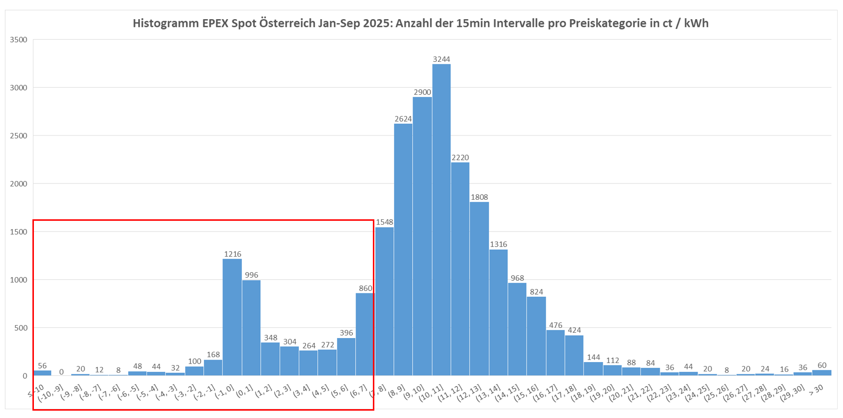 Das würde mich sehr interessieren, wie du über das Jahr gesehen, "nie unter 10ct/kWh einspeise" zusammenbringst. Die heurige Spotpreisverteilung, die die üblichen von PV produzierten Mengen nicht berücksichtigt. Es sind einfach die Durchschnittspreise von der Börse. ![]() Da das Sonnendargebot und somit die PV Produktion jedoch just in den Stunden mit den niedrigsten Preisen das höchste ist, ist heuer der mengengewichtete Durchschnittspreis ca. 4 ct/kWh für eine "Standard PV Anlage" in Österreich, basierend auf dem EPEX Spot AT AT [Außentemperatur] Day Ahead. Wenn man genügend Batterien oder andere Flexibilitäten hat, oder die Einspeisemengen aufgrund des hohen Eigenverbrauchs marginal sind, dann kann man natürlich auch andere Durchschnittspreise für die eingespeisten Mengen erzielen. Das bedeutet aber, daß man in der Lage ist, in der Zeit von April bis September und von 10-16 Uhr die Einspeisung zu minimieren. Da der mengengewichtete Durchschnittspreis ca. 4 ct / kWh ist, ist ein Fixpreisaufschlag von 1,86 ct / kWh halt ein recht großer Kostenbrocken, den man bei sinkenden DayAhead Preisen mitkalkulieren muss. Daß es ein paar einzelne Stunden mit > 40 ct/kWh gibt, ist dabei für die Jahresbetrachtung irrelevant, da sie so selten sind und man zu diesen Zeiten nicht die ganze Tages-, Monats- oder Jahresproduktion einspeisen kann. Anbei das Histogramm von Jan-Sep. Die Anzahl der Viertelstunden in dem jeweiligen ct/kWh Bereich. Aufpassen, diese Darstellung brücksichtigt nicht die verfügbaren Mengen pro Viertelstunde, die deine PV Anlage produzieren kann. Der Großteil der Jahresproduktion kommt in dem roten Rechteck vor. Daher ist der Jahresdurchschnittspreis so niedrig. ![]() |