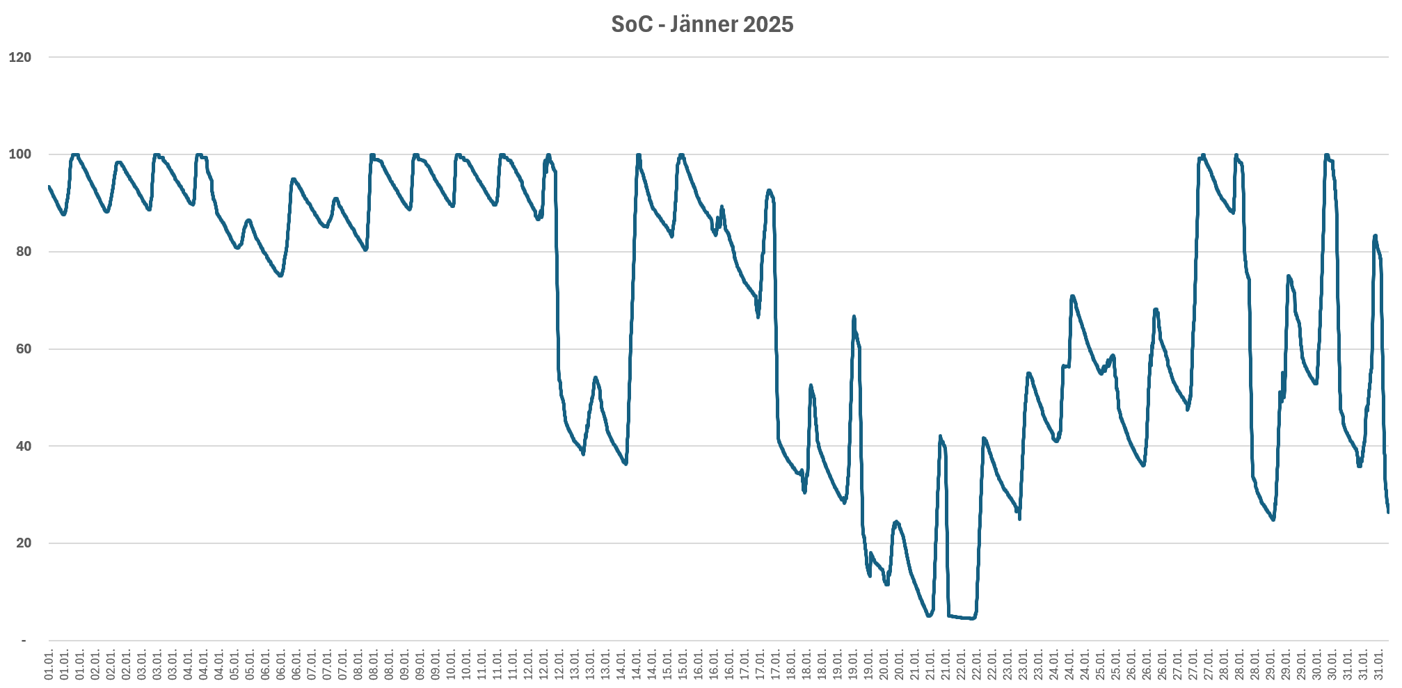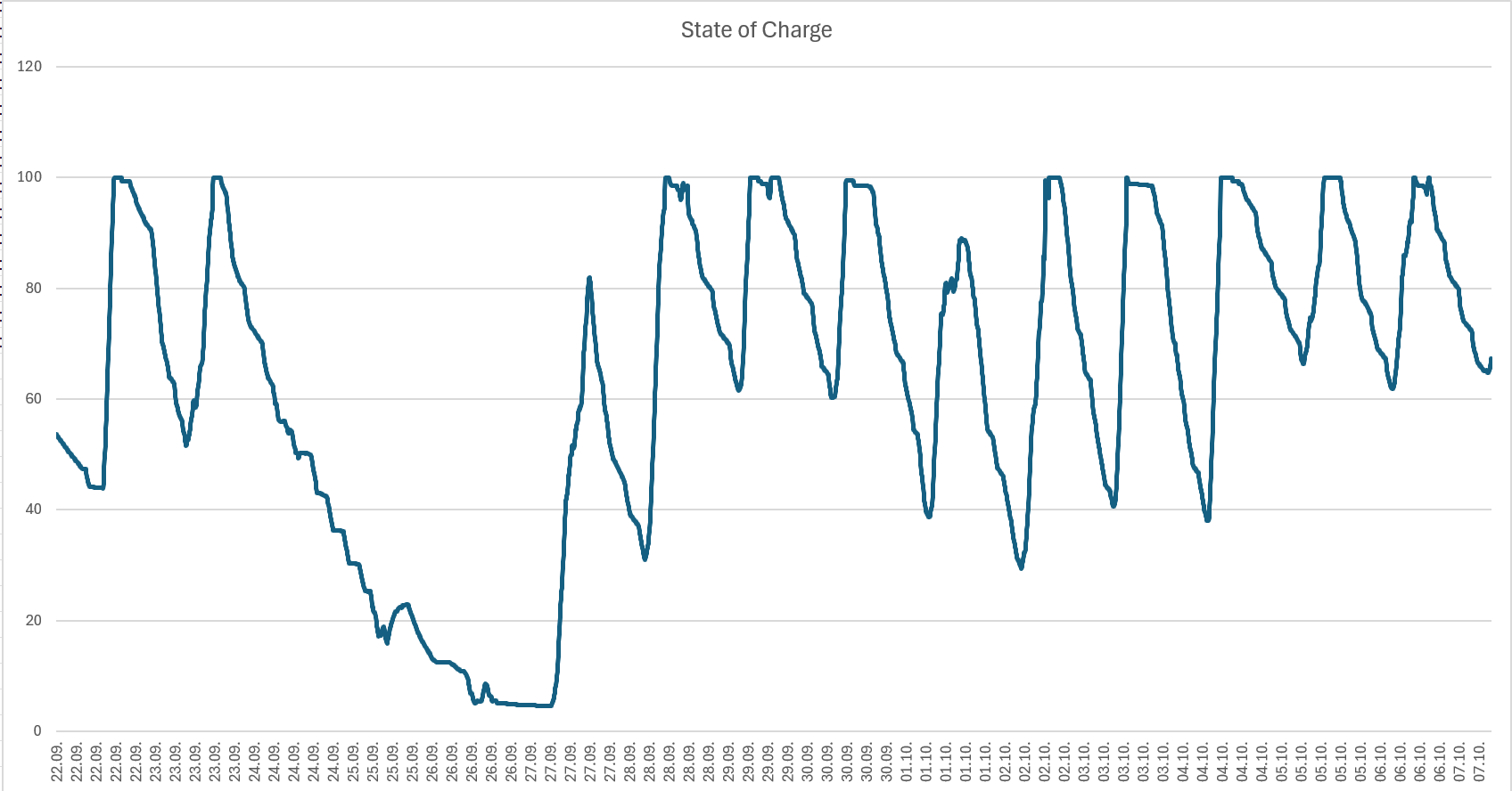Durch die Energiegmeinschaft und das Ziel die Familie zu versorgen, kommt zum Eigeninteresse noch das Familieninteresse dazu, daß die Wirtschaftlichkeit der Batterieinvestition vor allem im Zeitraum April-Sept verbessert. Seit Mitte September ist die Batteriesteuerung umgestellt, damit bei den kürzer werdenden Tagen und den manchmal längeren Schlechtwetterperioden, die Autarkie im eigenen Haus priorisiert wird. Anbei die SoC Kurve der letzten 14 Tage. Man sieht recht schön, wie die recht große Batterie die 3 Tage lange Schlechtwetterperiode vom 23. - 27.9. abfedern konnte und erst am 27.9 in der Nacht minSoC erreichte. So wie bei Dir mit HeizungsWP, Warmwasser, BEVBEV [Battery Electric Vehicle, Elektroauto] und sonstiges. Was auch interessant zu beobachten ist, wie lange die Batterie noch im 100% Zustand pro Tag steht. Es ist ein Indikator wieviel "Reserve" die Anlage noch hat, die Batterie ggfs noch füllen zu können, wenn das Wetter schlechter wird, oder der (Nacht)Verbrauch steigt. ![]() Daß die SoC Kurve von Mitte November bis Ende Jänner natürlich anders ausschauen wird, ist auch klar. So war sie letzten Jänner noch ohne WP WP [Wärmepumpe] (und Urlaub bis 11.1). ![]() Wird heuer mit WP WP [Wärmepumpe] wohl anders aussehen ![]() |