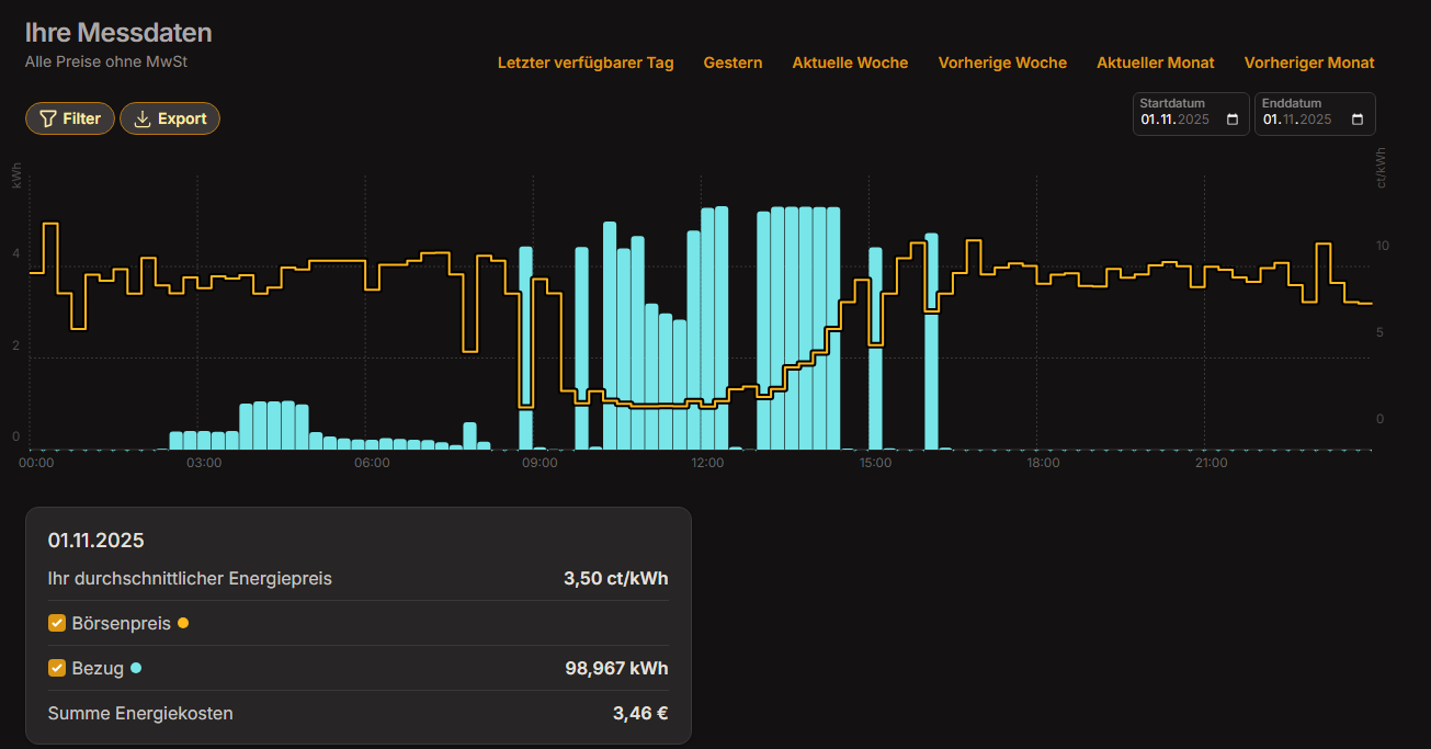 ich bekomm die Viertelstunden-Daten eh aus dem NetzOOE Portal, bzw. kann sie dort selbst downloaden das muss ich dann eben im Excel händisch mit den Börsenpreisen verknüpfen und kann das dann validieren / nachvollziehen ist halt ungleich aufwändiger als die Weise wie mir das Spotty präsentiert |
