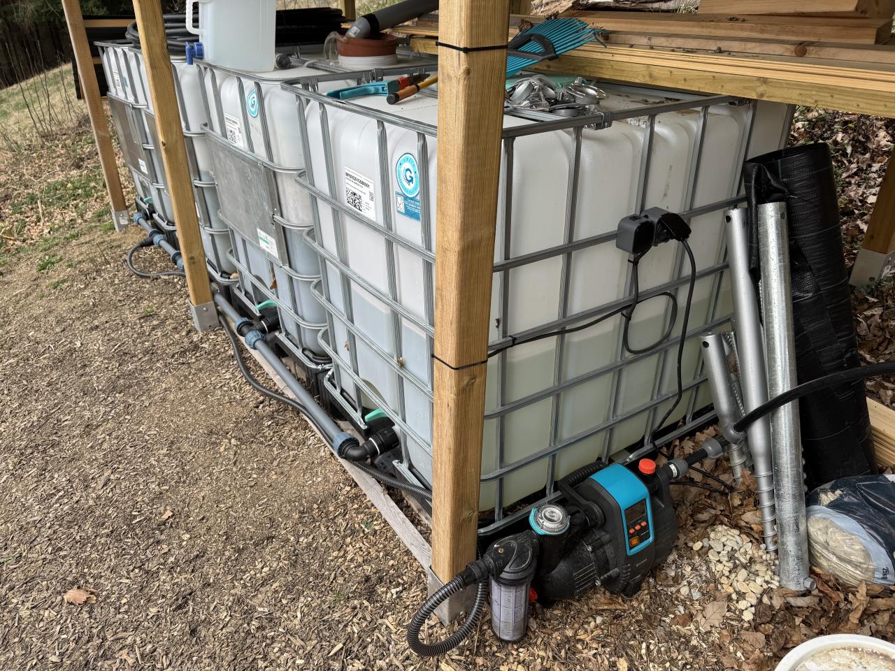 für unser wasserloses Gartenhaus haben wir vier 1000l-Container installiert und sammeln Regenwasser und Pumpen Wasser aus einer Überlaufquelle in die Container. Um besser haushalten zu können, wollte ich eine Füllstandsüberwachung installieren. Ich möchte hier kurz vorstellen, wie wir das gemacht haben: