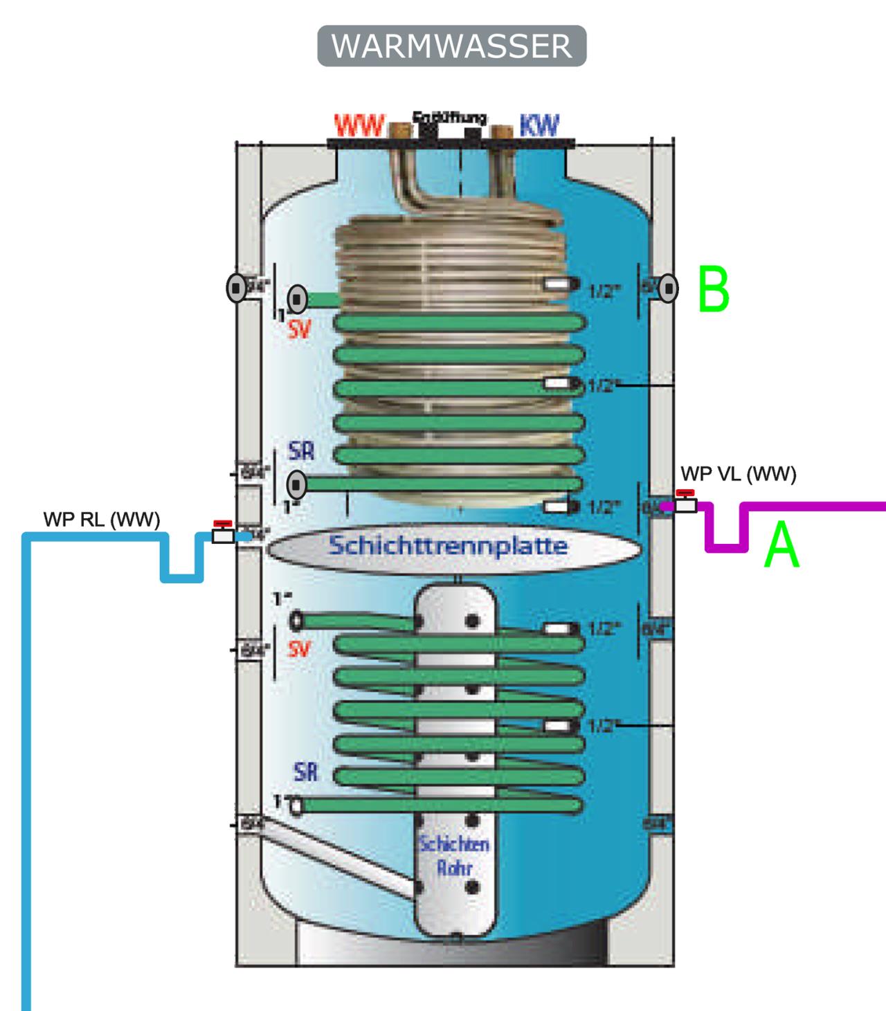 Auch kann ich empfehlen, die Beheizung "von unten" also WW WW [Warmwasser] VL VL [Vorlauf] und WW WW [Warmwasser] RL RL [Rücklauf] auf niedriger Höhe zu machen, das funktioniert echt gut, zerstört die Schichtung nicht und es fällt der Verlust über den oberen heißen Anschluss weg. Auch kommt man schneller auf höhere VL VL [Vorlauf] Temperatur als wenn man den ganzen Speicherbereich umkrempelt.