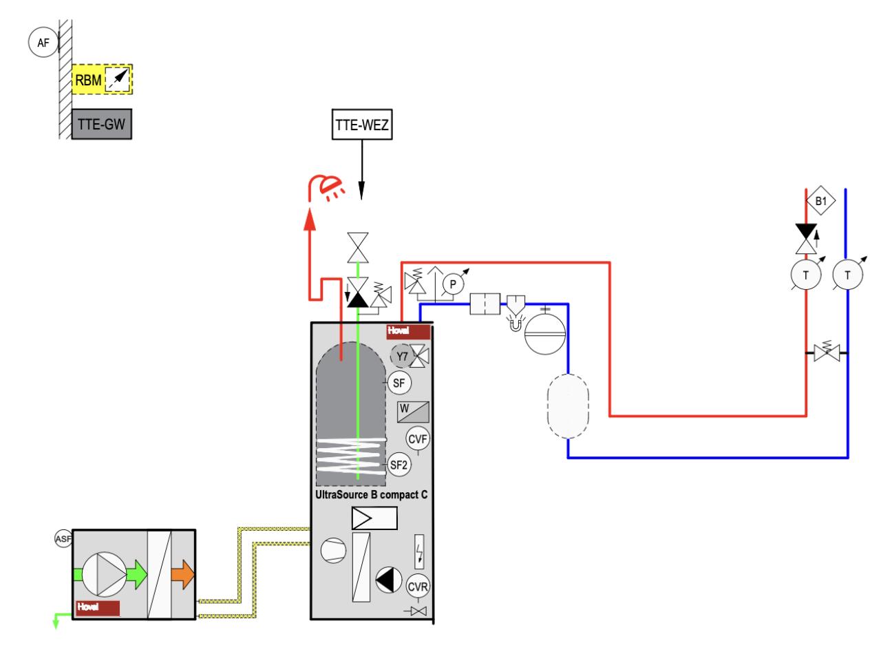 Hoval UltraSource 8 Compact 200 Liter Boiler integriert, mit 100 Liter Speicher https://www.hoval.ch/de_CH/Heiztechnik/W%C3%A4rmepumpen/Luft-Wasser-W%C3%A4rmepumpen/Splitaufstellung/UltraSource-B/UltraSource-B-compact-C/p/B_ultrasource-b-compact-c#downloads Überströmer https://www.caleffi.com/sites/default/files/media/external-file/01007_de.pdf Skala 1-6, sieht aus wie das oberste im PDF. Eingestellt auf 1 - im Normalbetrieb also nicht offen. Erwartung ist, dass es maximal öffnet, sobald Pumpe von 45 auf 100 springt. Allle Heizkreise sind immer voll offen. Ventile entweder auf N oder reduziert, wenn zu warm. Durchfluss bei ca 12l/min, im Abtaumodus auf 29 l/min - rauscht in Installation. Wie gesagt, ist der nicht wie in der Zeichnung eingebaut, sondern direkt über Vor- und Rücklauf - nicht über seriellen Speicher. |