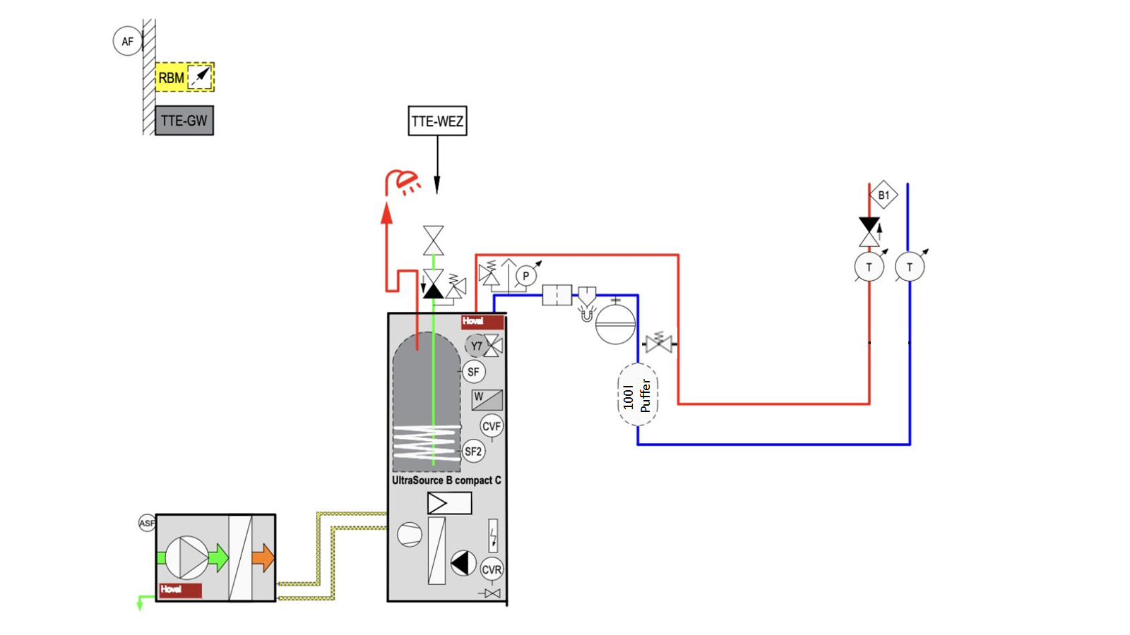Überströmer ist ja drin und wo soll der im RL RL [Rücklauf] befindliche Reihenpuffer sein? Da hast mit deinem Heizi bissl ins Klo gegriffen, außer bei der Auslegung der WP WP [Wärmepumpe]. |