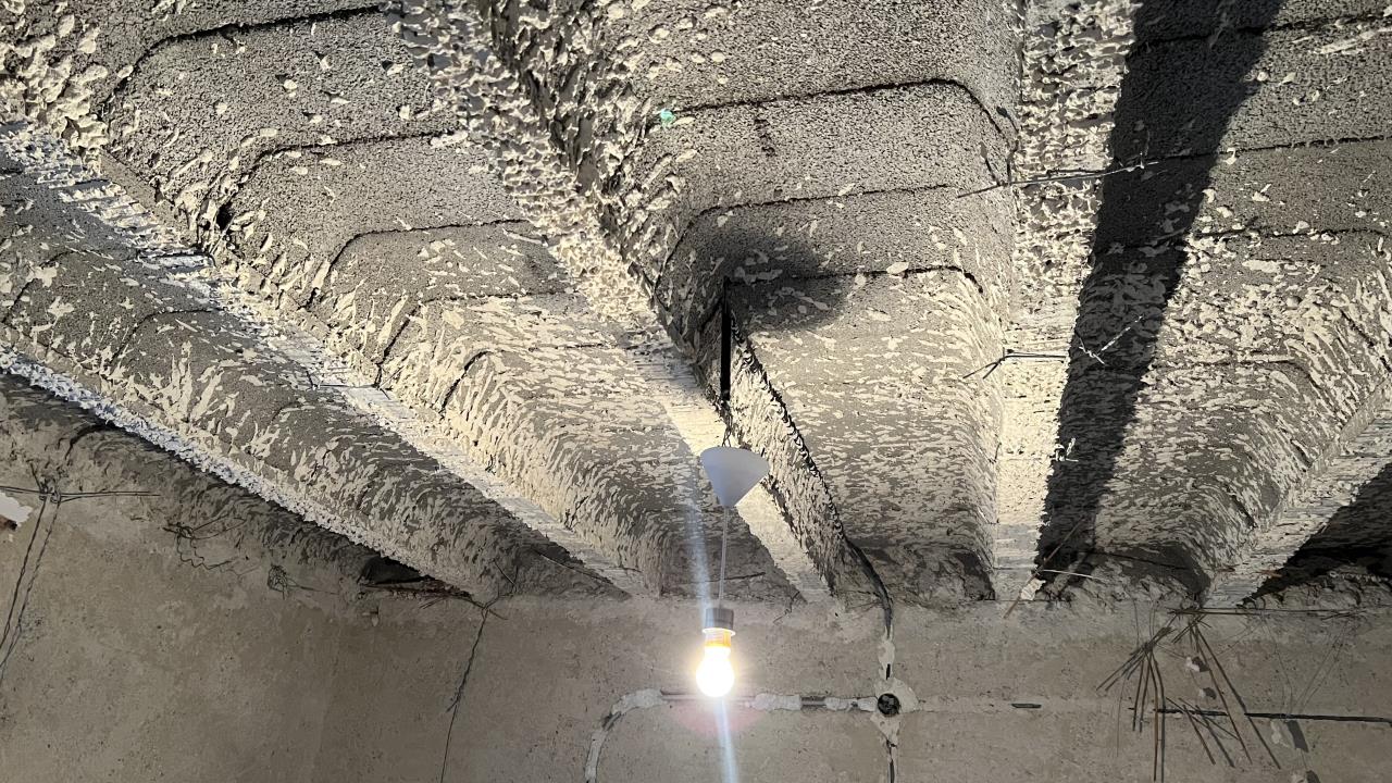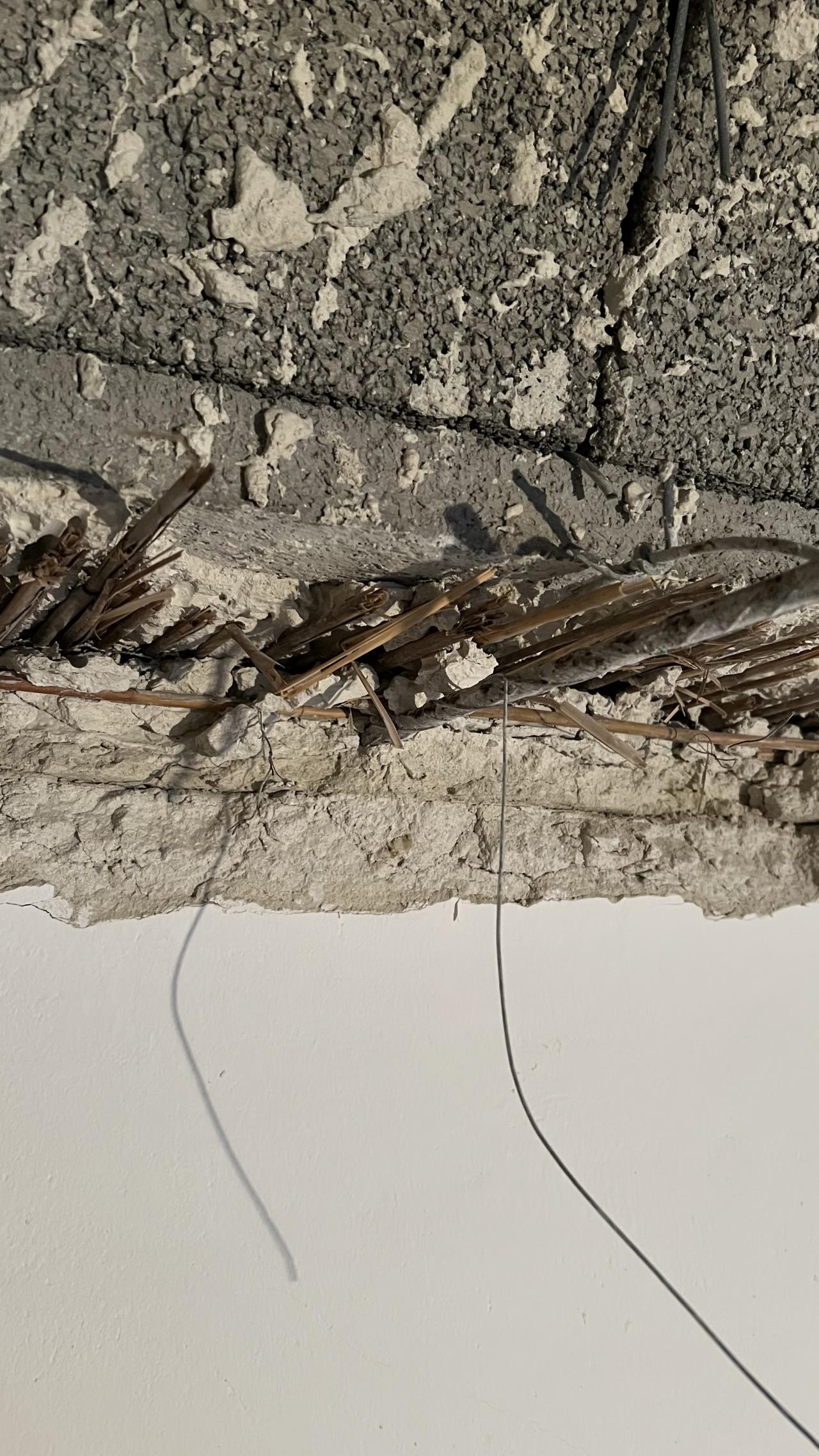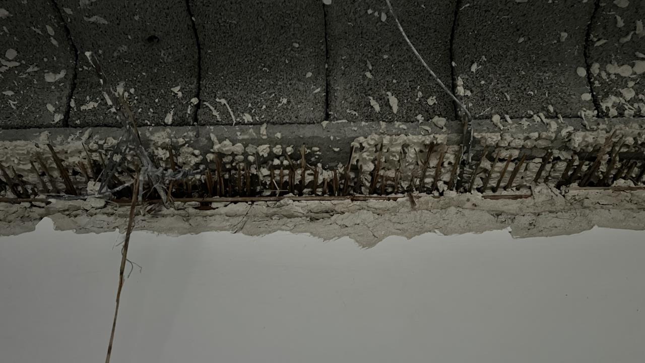 Nun zum Problem: Ich habe einmal im Schlafzimmer mit dem Entfernen der Decke begonnen und musste leider feststellen, dass die Wand zum Nachbarn oben mit der Schilfrohrdecke fixiert war. Das sieht man auch an den herausstehenden Baustahlstäben (s. Fotos). Über der Mauer kann man sehen, dass die Decke eigentlich bis zum Nachbarn hinüber "weitergeht" und nun die Wand von der Decke nicht mehr gestützt wird.