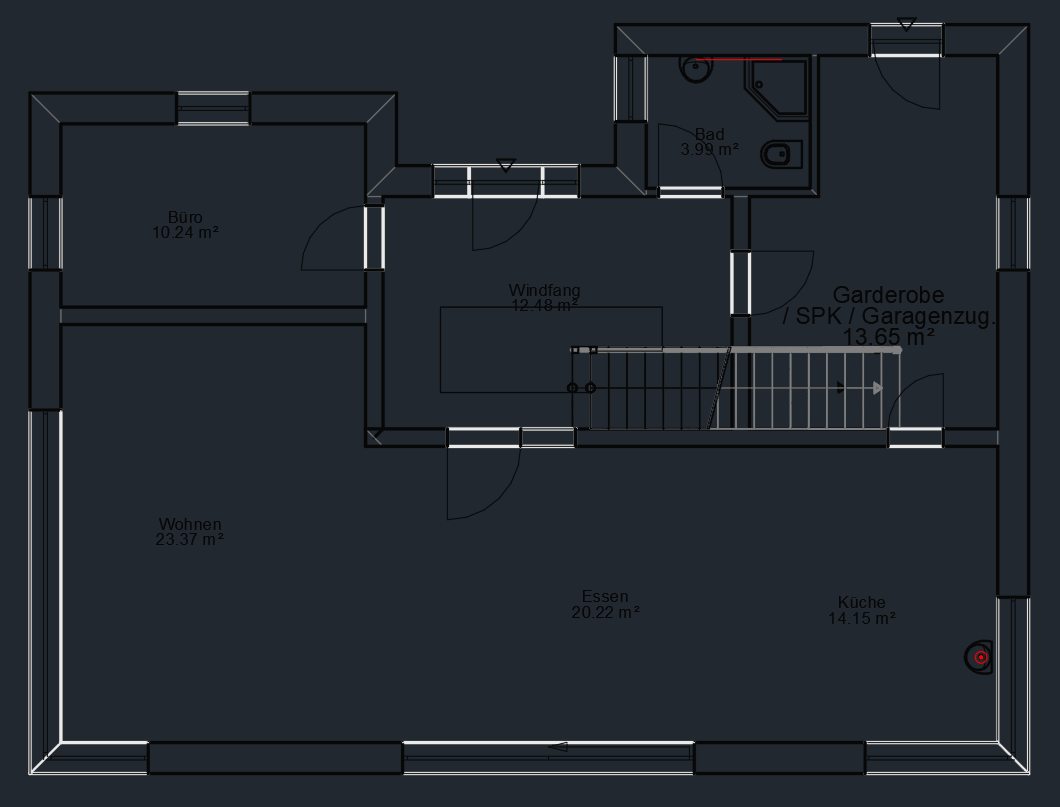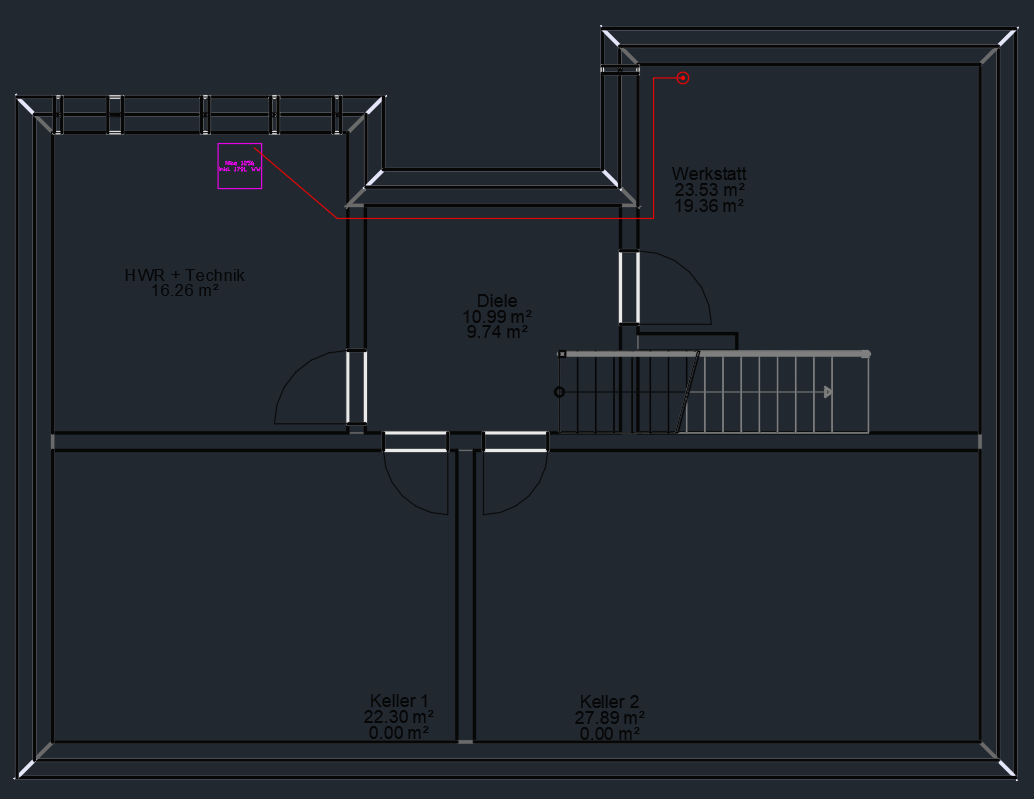 Zunächst einmal sind schwarze Striche auf dunkelgrauen Hintergrund zimlich anstrengend anzuschauen :D Ich habe eine ähnliche Konstellation, und dann aber den Warmwasserboiler da hingeschoben wo er auch Sinn macht. Unter Bad/Küche im EG. Dann waren die Leitungen auf einmal doch deutlich kürzer. |