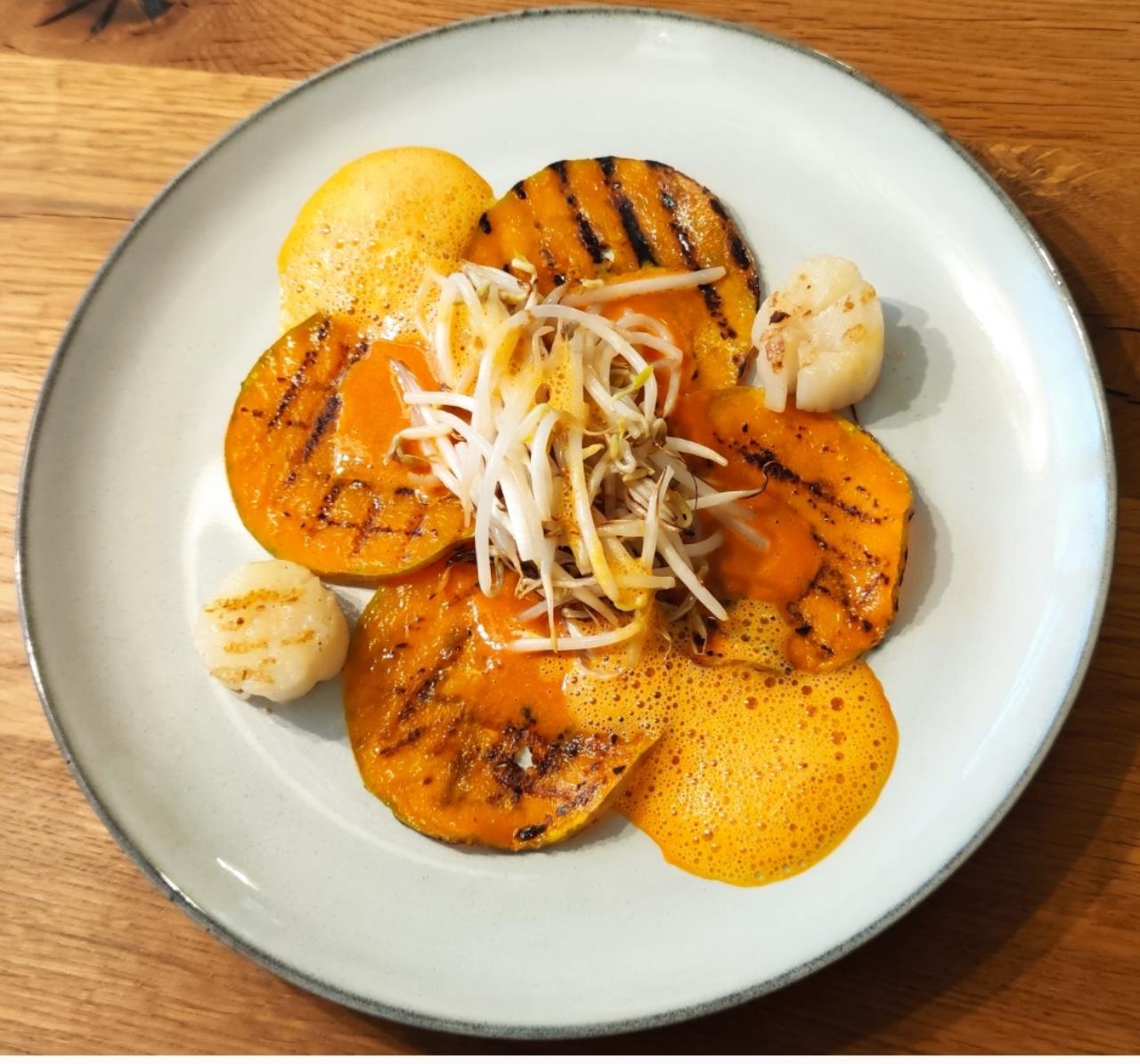 Gebratenen Jakobsmuscheln & Garnelen im Tempurateig, an getrüüüffffeltem, gebuttertem, grandiosem Kartoffelpürree, dazu Chilli- Ofenparadeisersauce (aus Eigenanbau) mit Kräutern aus dem Garten & Baguette