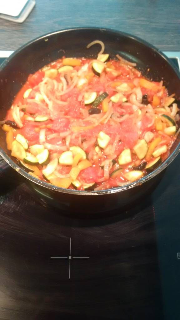 Pipe Rigate mit Tomaten, Zwiebeln, Oliven, Zucchini und geschälten Paprika: Mahlzeit bautech |