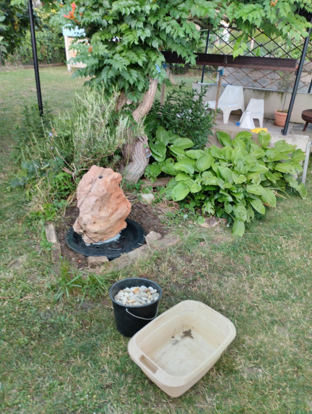 Hier mein Wochenendprojekt - Quellstein: Ein Besuch der Garten Tulln im Frühjahr hat ein teures Ende gefunden Zuerst die Inspiration, dann die Transpiration. Der Sandstein ist 70cm hoch und sitzt auf einem Kunststoff-Becken (90Liter und 60cm Durchmesser) mit GFK-Deckel. Wegen Kindern im Haushalt habe ich den Stein noch sicherheitshalber mit MS-Polymer-Kleber verklebt. Jetzt muss ich noch das Stromkabel verlegen, den Schotter am Deckel ausbreiten und das Beet wieder manierlich herstellen. 14kg? Respekt! Bei mir waren es 5kg und ich bin beim Entkernen narrisch geworden! |