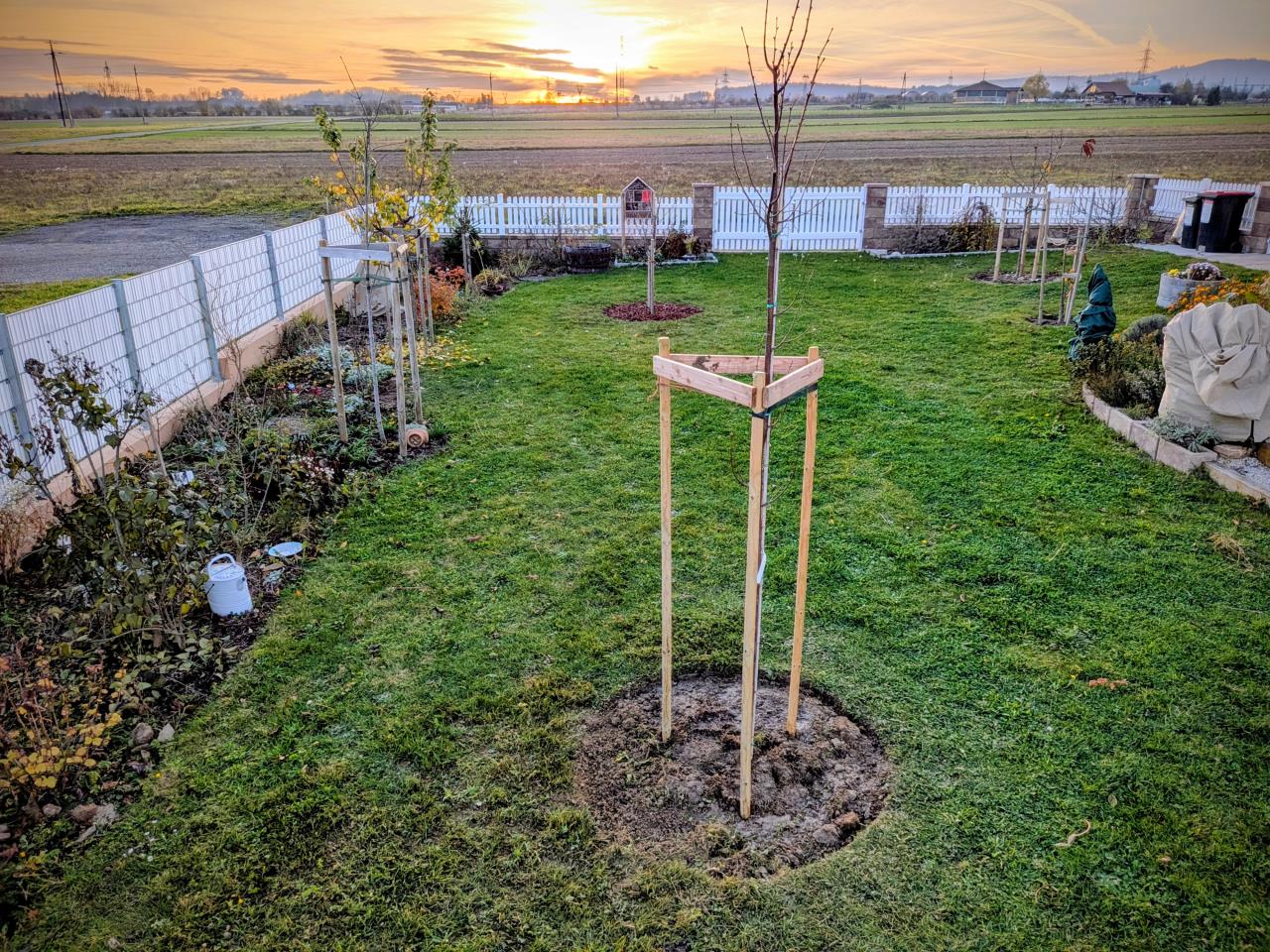 Am Wochenende wurden 2 neue Bäume gepflanzt, eine Winterlinde (im Vordergrund) und ein Apfelbaum (weiter hinten). Außerdem noch eine Zwetschge, aber die ist nicht im Bild. |