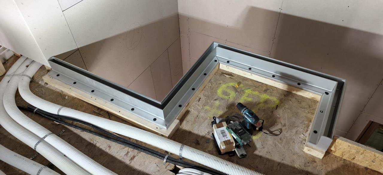 Das sind Schienen, die ich bei Steelproduct in OÖ online bestellt und auf Maß+Gehrung hab schneiden lassen. Inklusive Befestigungsmaterial für die Scheiben, Montagewerkzeug, Abdeckleisten zum Parkett hin und Versand knapp über 700 Euro. Glasneigung verstellbar!
