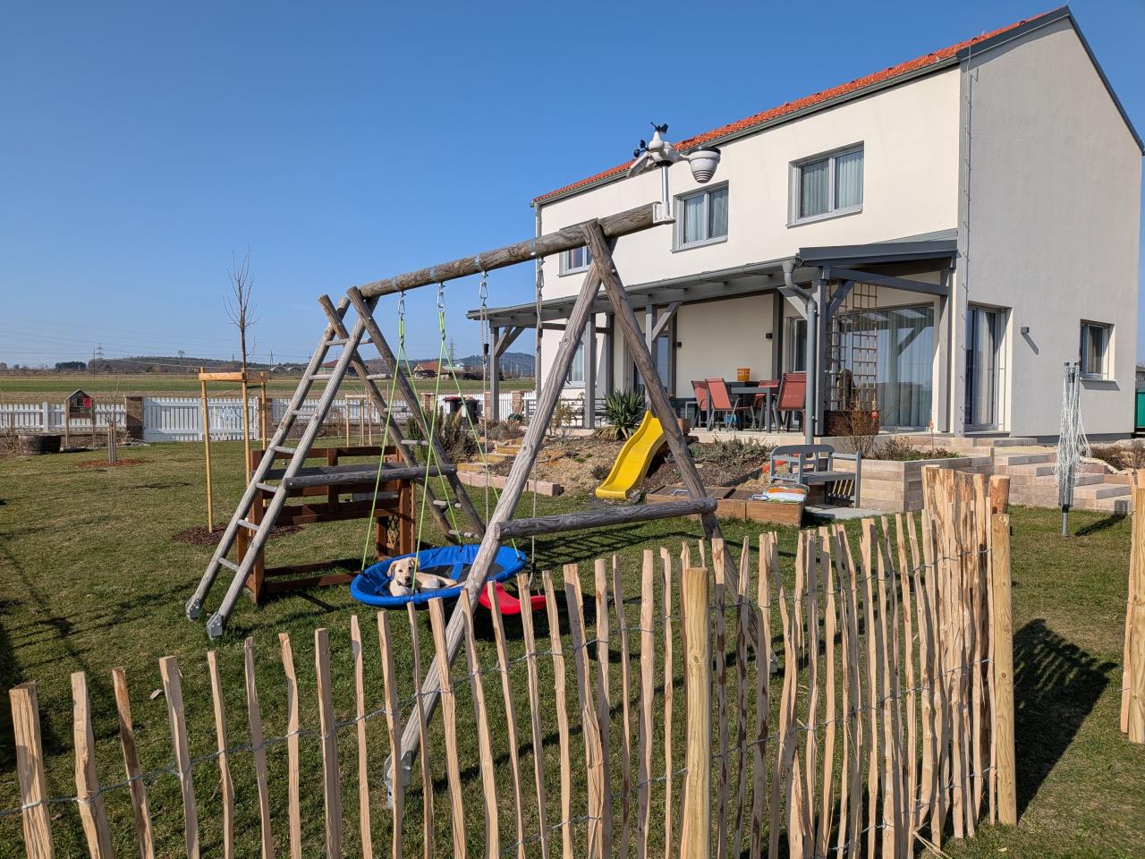 Während der feine Herr Hund das ganze aus der Schaukel beobachtet: