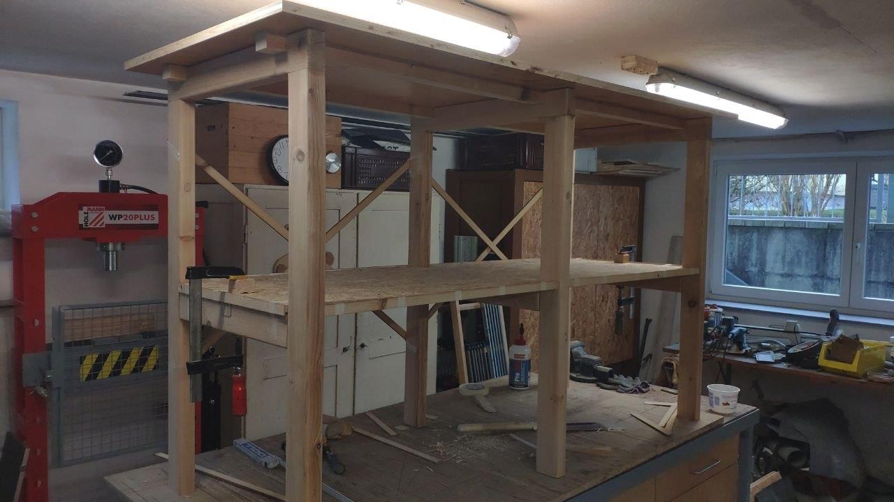 Tisch für den Trockenraum gebaut, nicht nur heut, alles aus geschenktem Holz. Die Aufleimer müssen noch glattgehobelt werden und dann das ganze lackiert, die Platten sind abnehmbar, damit ich das 175x75 Ding in den Raum bringe. Alle Ausklinkungen mit der Hand gearbeitet ... nicht besonders sinnvoll, aber entspannend. |