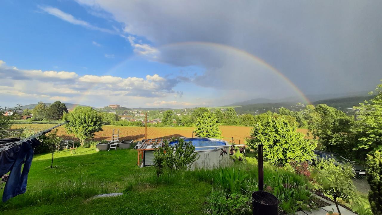 gestern/heut in 6..8 Regenpausen Pflanzen in die Hochbeete umgesetzt, Grassamen nachgestreut an glatzerten Stellen, nach 1 Monat meinen Fugenkratzer wieder gefunden im Unkraut, Rasenroboterkabel umverlegt, Erbsen auf Rankhilfe aufgefädelt und mich über einen wunderschönen Regenbogen gefreut.