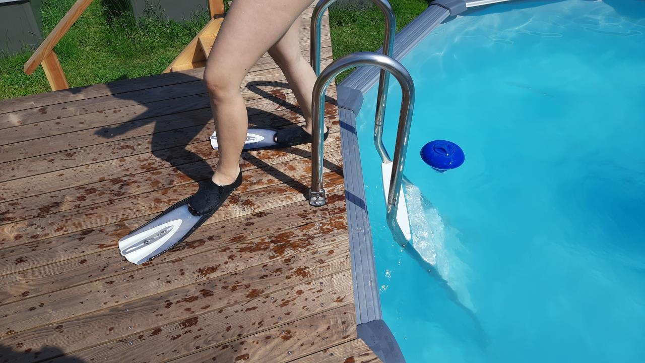 Nabend, 2 Seite der Poolleiter abgesaglt und montiert. Jemand musste sie gleich testen. Ist auch Flossengeeignet... LG |