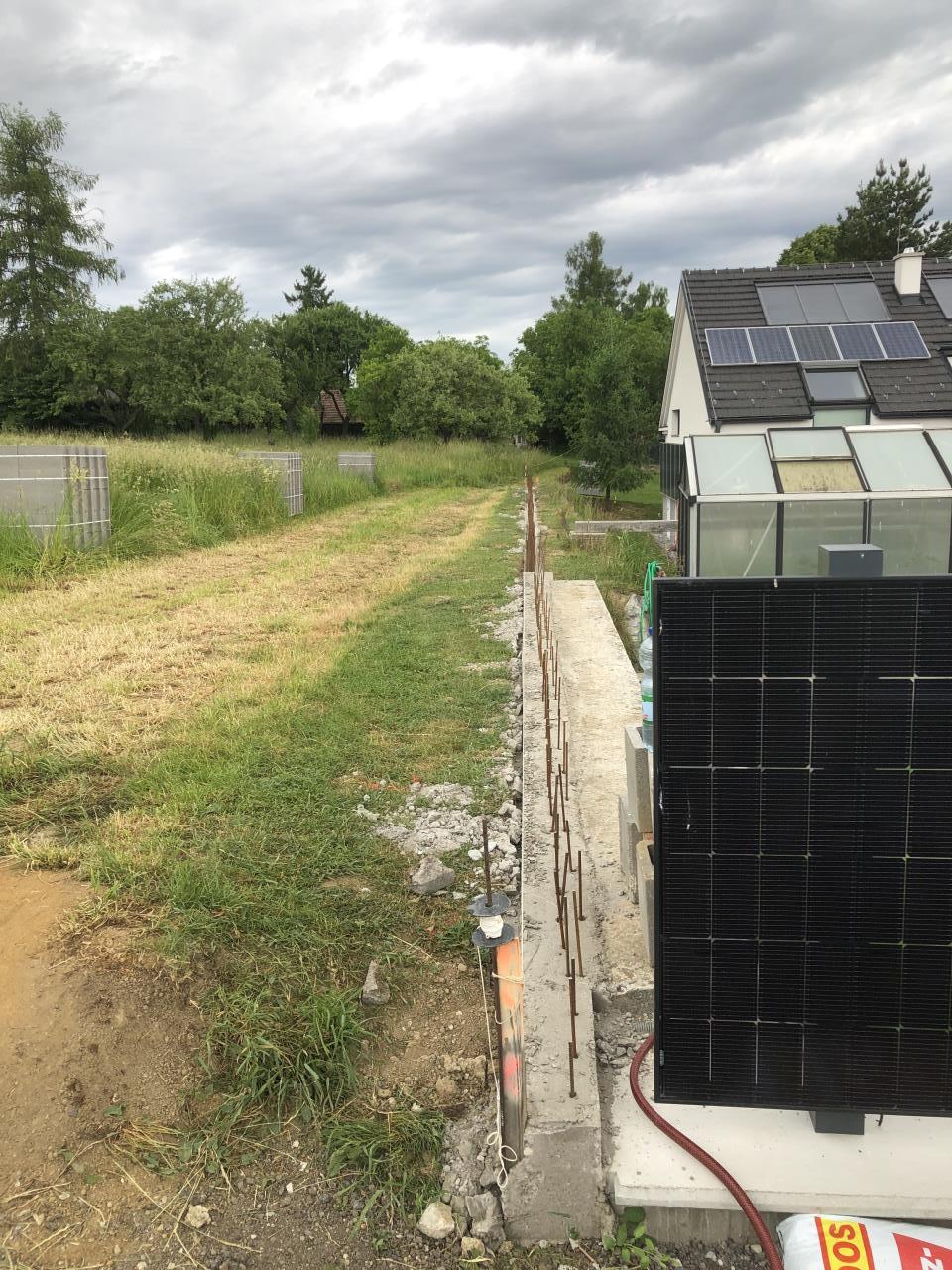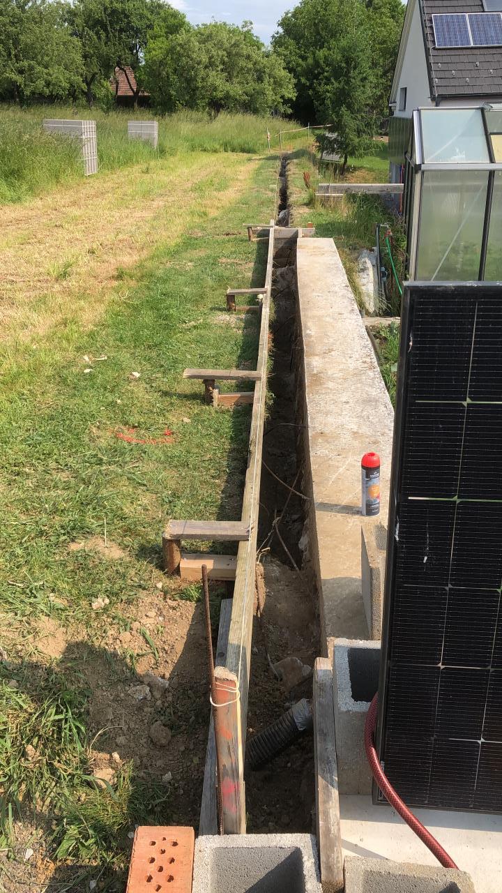 Am Dienstag ausgegraben. Am Mittwoch die Schalungen gebaut. Heute ein bisschen Bewährung reingelegt um einen Verbund zu der bestehenden Wurfsteinmauer zu bekommen. Jetzt am Abend noch die Höhen nivelliert. Morgen werden die 54 m betoniert. |