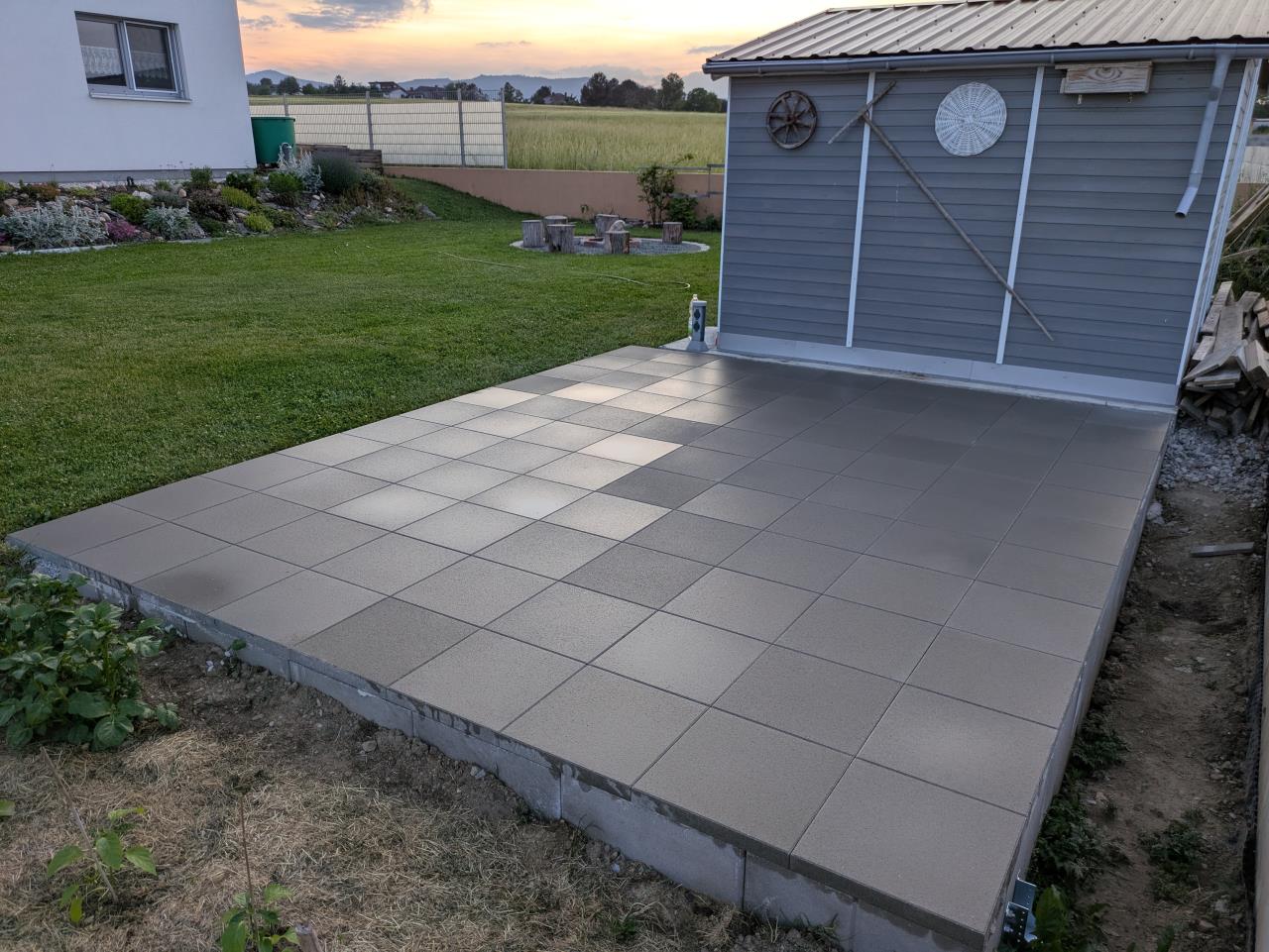 Es ist vollbracht. Und ich bin hin. Die ist mit ihren 45kg bei solchen Arbeiten eher moralische Hilfe. Einer ist sogar Hackler bei einer Baufirma. Der hat mir dankenderweise den Unterbau mit der Rüttelplatte verdichtet, aber ansonsten ist der selbt den ganzen Tag gut eingespannt. Und die anderen Nachbarn... da wär meine Frau mehr Hilfe. |