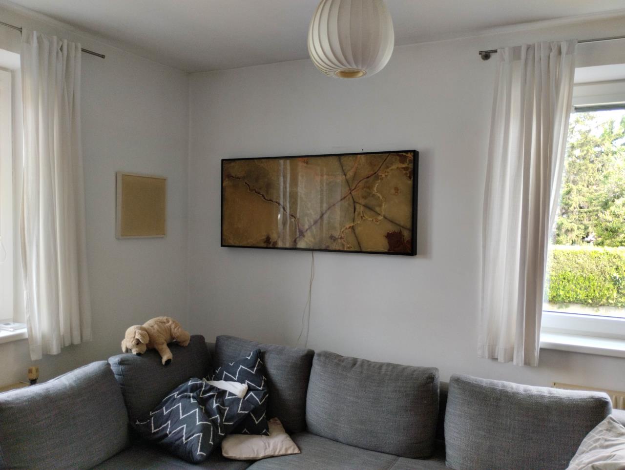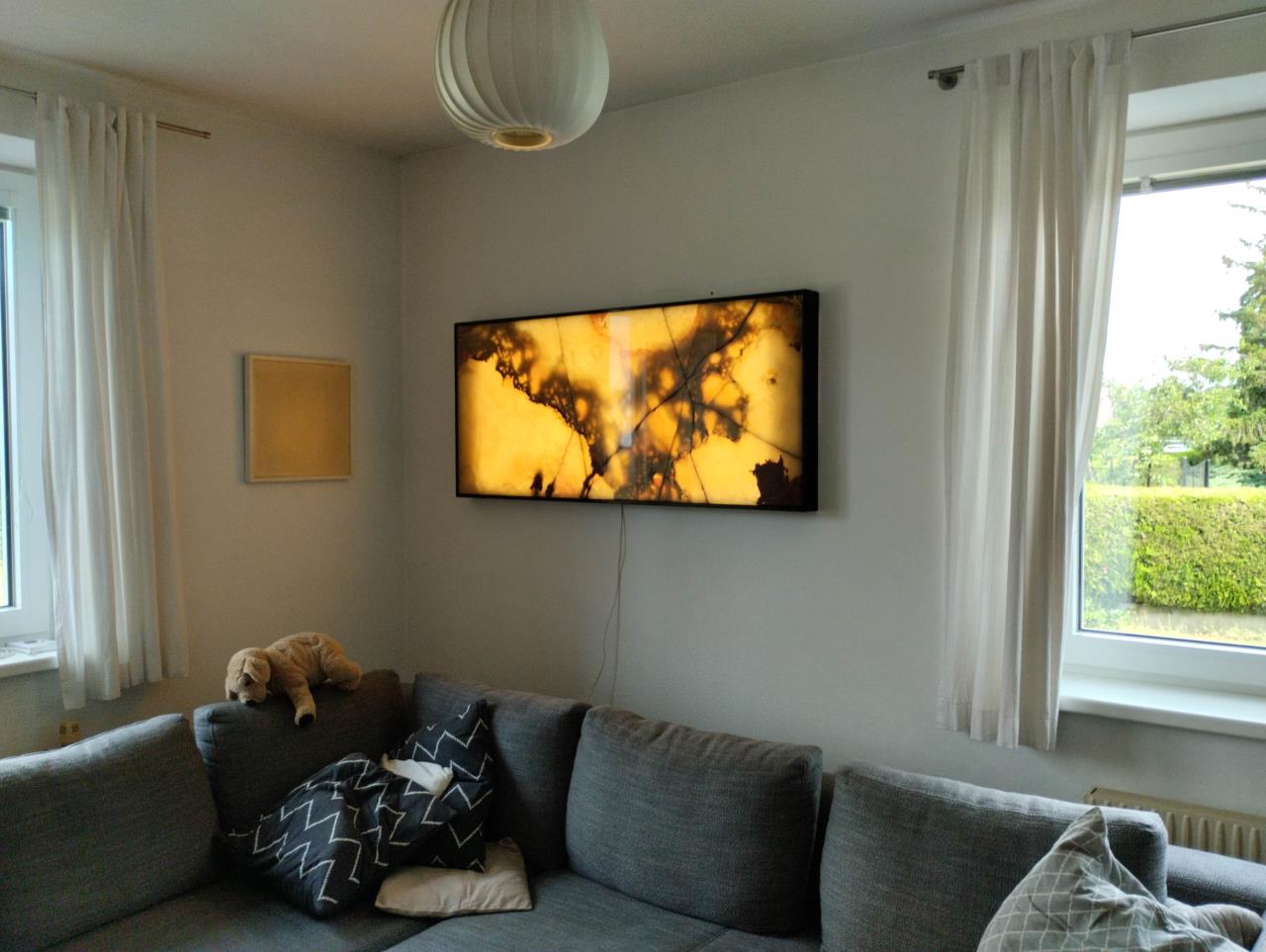 Endlich nach 3jahre des Sinnierens und Tüftelns hab ich endlich einen passenden Betrieb gefunden, der unsere Idee handwerklich umgesetzt hat. Upcycling einer alten Tischplatte aus Onyx, die ich vor Jahren einmal von einer Bekannten geschenkt bekommen habe. Beleuchtet von hinten mit einem LED Panel und schön gerahmt mit schwarzem Kunststein. Es hat zwar einiges gekostet, aber ich bin begeistert. Möglicherweise werde ich noch eine Steckdose hinter dem Bild setzen, damit das Kabel verschwindet. |