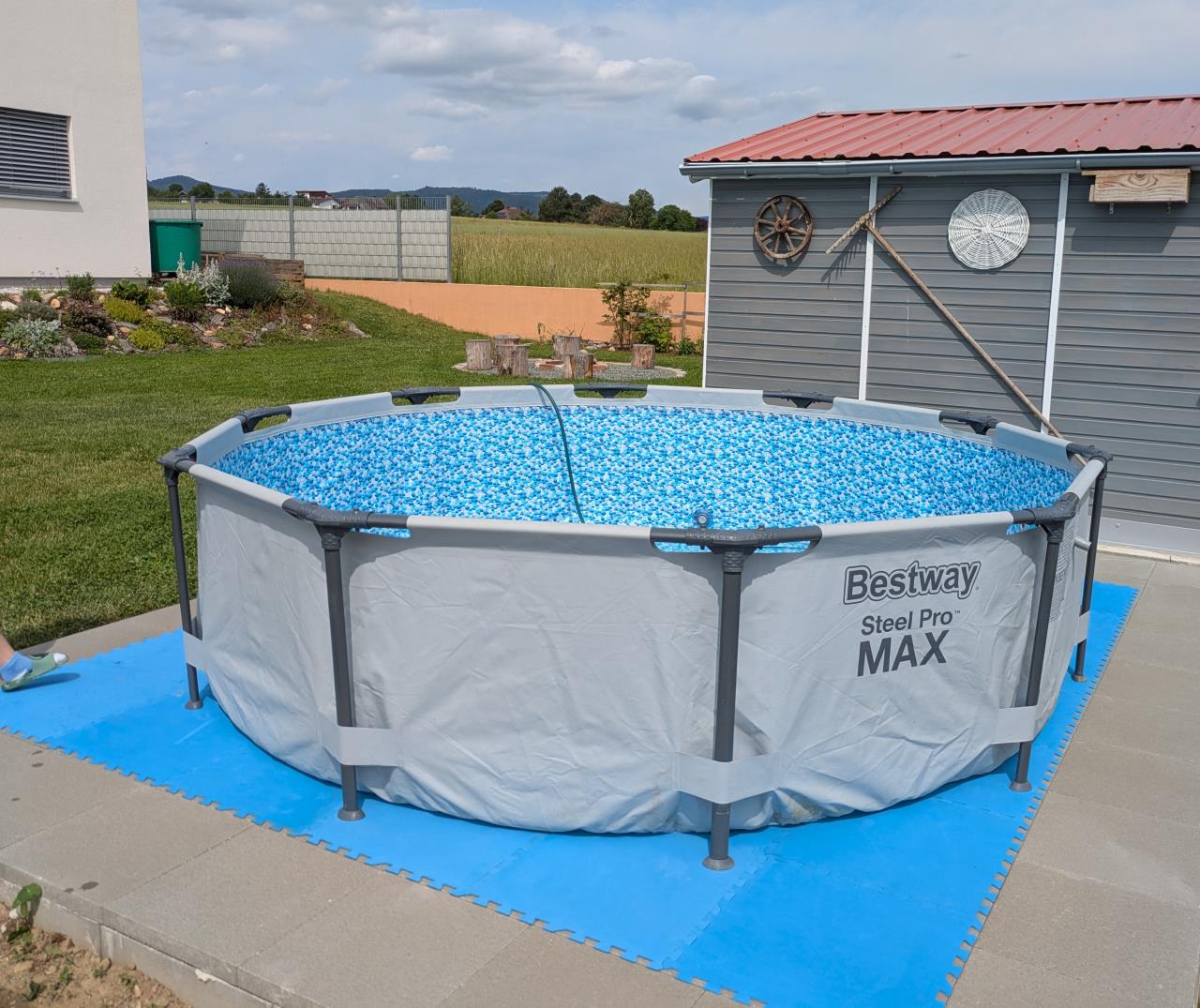Gestern gleich den Pool aufgebaut: Jetzt fehlt nur noch der Sichtschutz zu den Nachbarn, aber das hat keine Eile. |