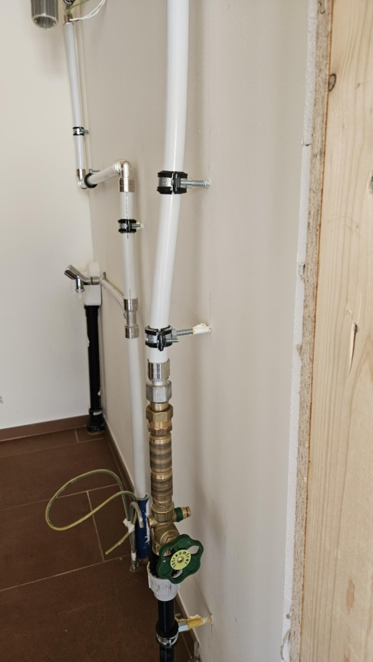 Ich habe euch Bilder angehängt, die eine der Hauptwasserleitungen (ein Mehrschichtverbundrohr) zeigen. Wie ihr sehen könnt, ist die Leitung zwischen den fixen Anschlüssen und den Schellen deutlich schief verlegt. Es scheint, als ob ein Versatz nicht fachgerecht durch Biegen oder Versetzen der Schellen ausgeglichen wurde, sondern das Rohr unter mechanischer Vorspannung "passend gedrückt" wurde.