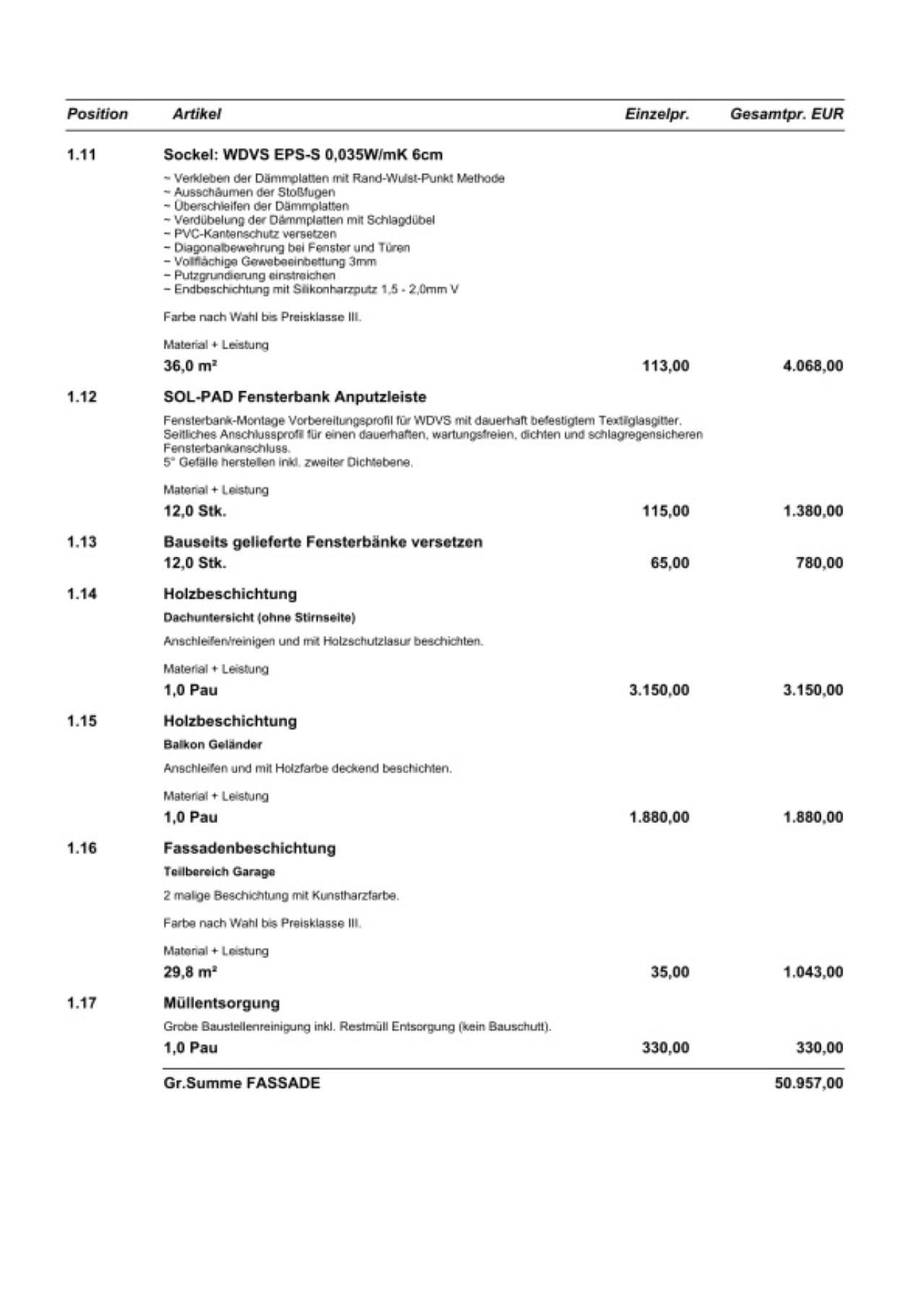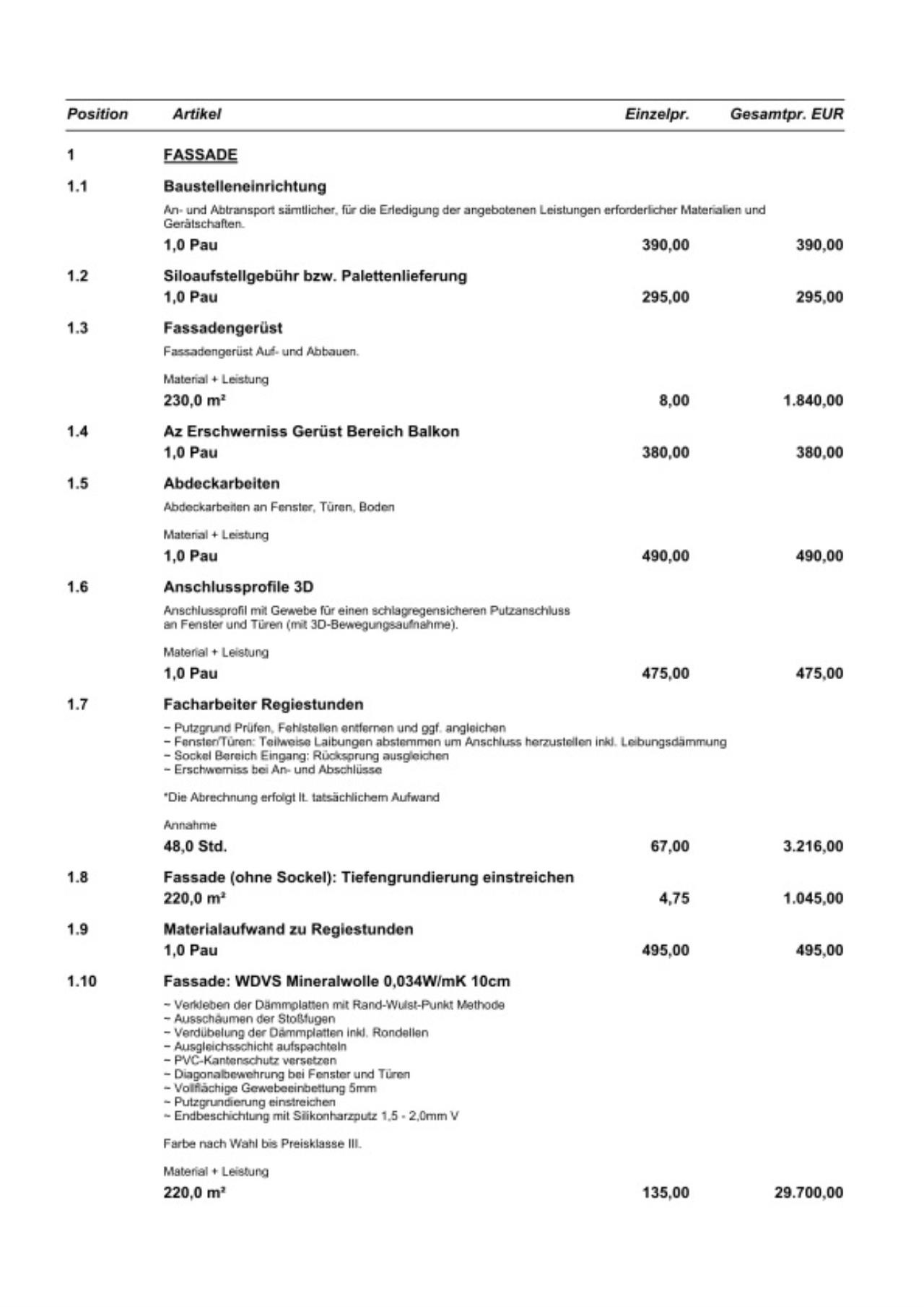 Fassade: 220m2, 10cm Mineralwolle 0,034 angeboten zu 40.800€ netto, d.h. 185€/m2, bei bauseits gelieferten Fensterbänken, und ohne Spengler für die Fallrohre.