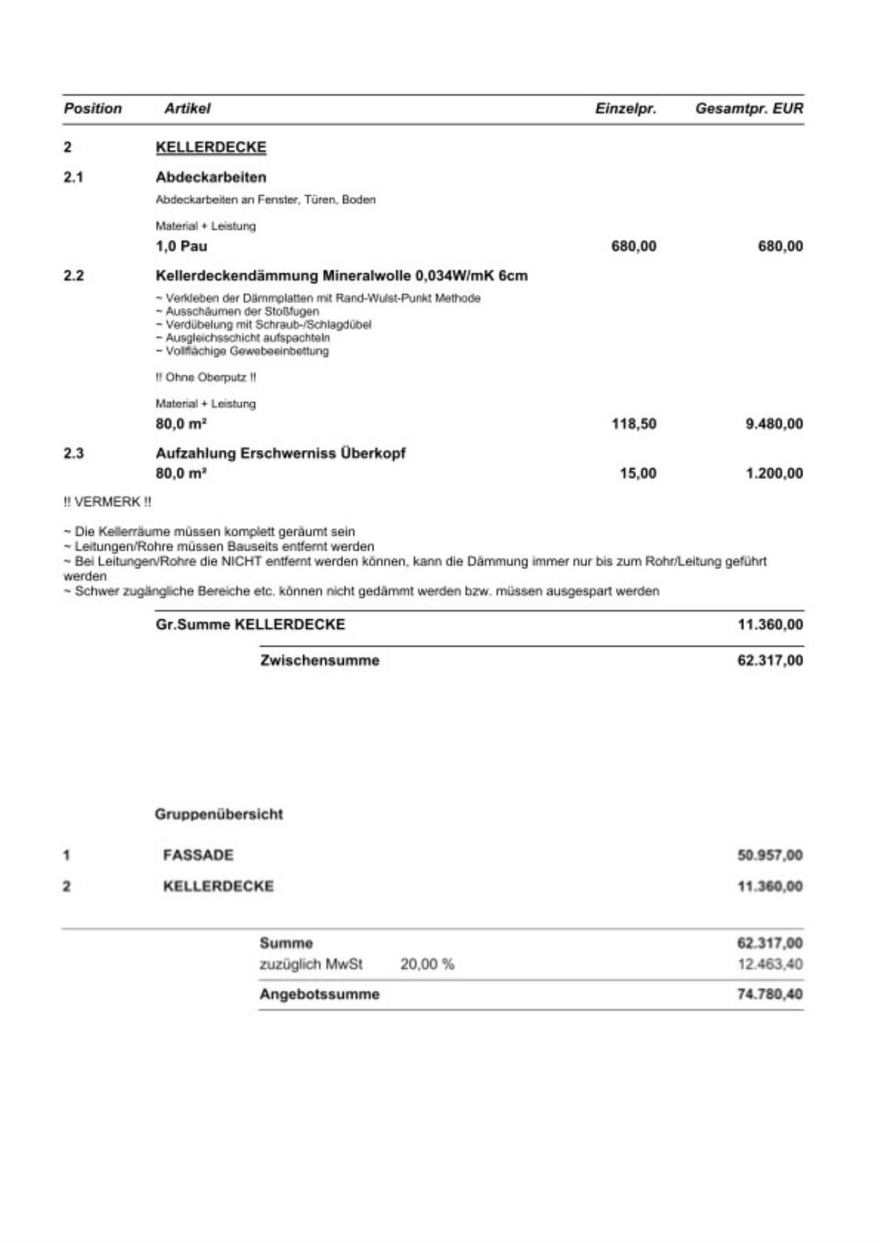 Kellerdecke: 80m2, 6cm Mineralwolle 0,034 angeboten zu 11360€ netto, d.h. 142€/m2.