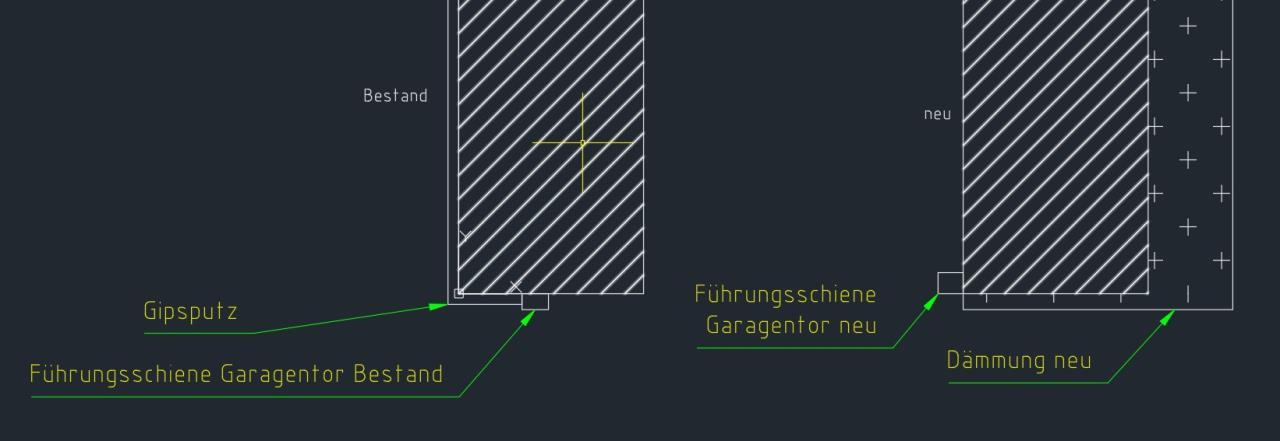 WDVS WDVS [Wärmedämmverbundsystem] aufgebracht. Derzeit sind die Tore mittig in der Laibung (Schwingtor), innen schließt ein Gipsputz an. Das neue Sektionaltor ist an der Innenseite angebracht, die Laibung wird dann noch gedämmt. De Mauer besteht aus Betonschalsteinen.
