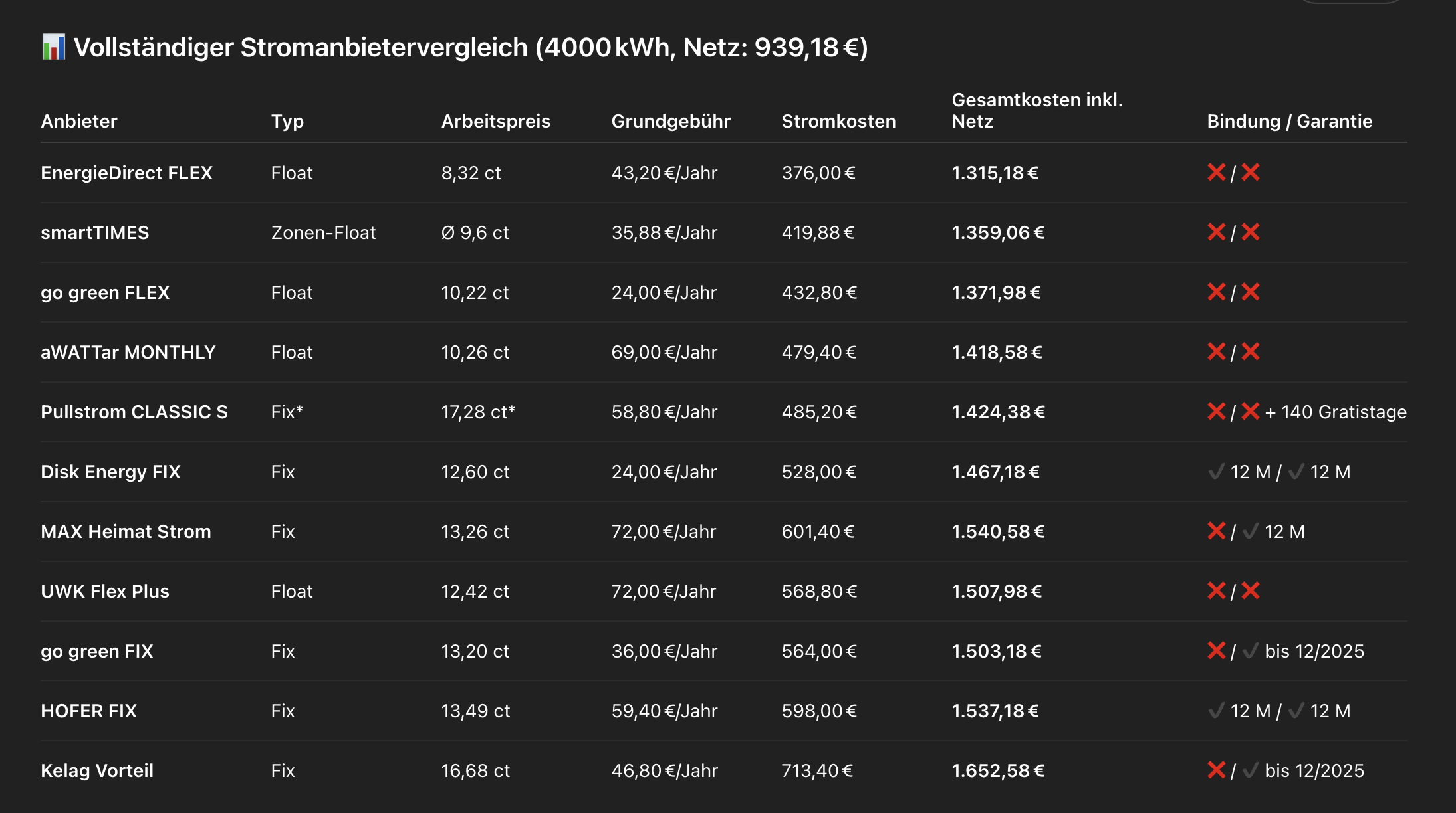Mein Verbrauch liegt bei ca. 4000 kWh/Jahr, und ich habe dazu einen Vergleich der aktuellen Anbieter gemacht (siehe Tabelle unten). Kelag liegt mit 1.652,58 €/Jahr relativ weit oben – ohne PV-Vorteil, weil die Einspeisung separat läuft.