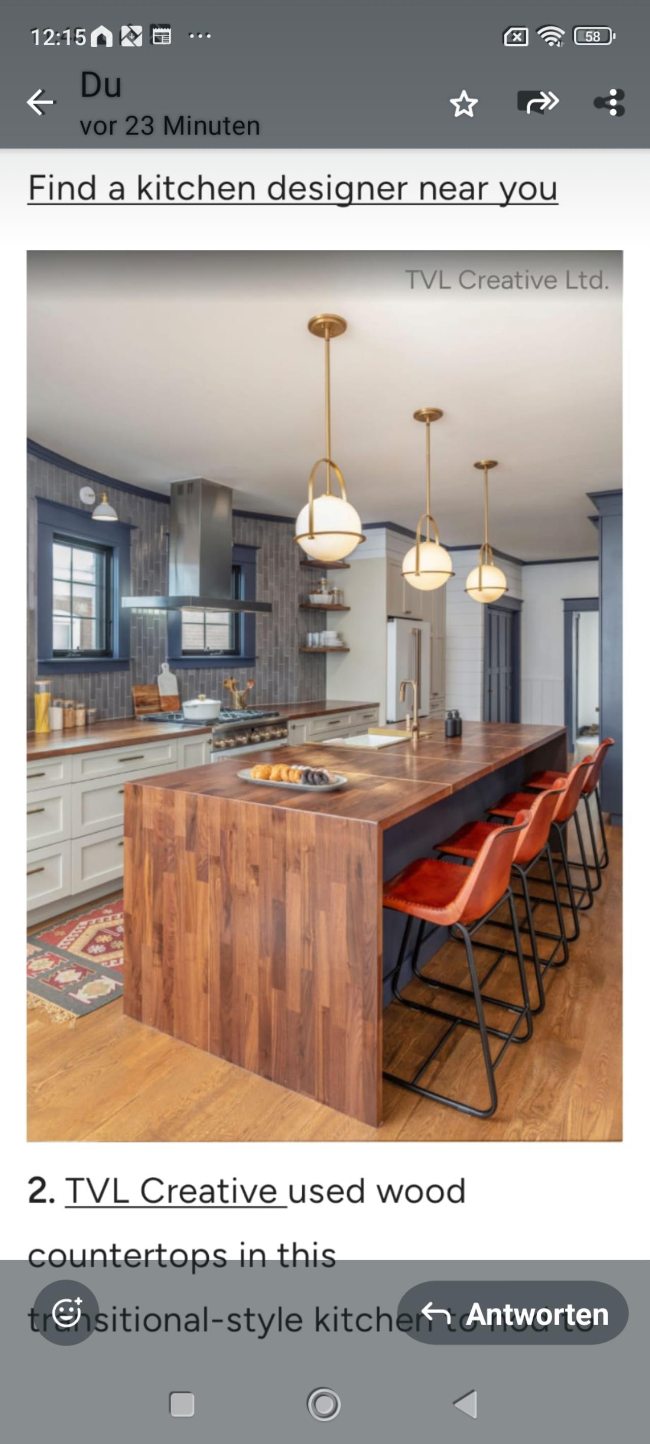 Auch ich wäre hier beim Stein. Bedenke, dass ein Raum nur eine geringe Anzahl an verschiedenen Holzarten verträgt. Wenn es also schon Eiche-Parkett und eine auffällige Nussbaum-Arbeitsplatte gibt, sollten weitere Möbel auch entweder aus Eiche oder Nussbaum sein. Wenn die Nussbaum-AP noch ein Thema ist, dann schaut Euch so etwas aber mal in Tischlerqualität beim Holz-Fachhändler an. Das Bild oben zeigt eher Baumarkt-Ware mit ziemlich schmalen Lamellen, die keilgezinkt sind - also auch in der Länge gestückelt. Wenn das breite Lamellen sind und möglichst lange oder sogar durchgehend, schaut das gleich ganz anders aus. Für mich würde die Platte auf so einer hoch belasteten Fläche allerdings auch ausscheiden, weil gerade Nuss leicht Dellen und Kratzer bekommt, man keine heißen Töpfe oder Bleche direkt hinstellen kann etc. Stein ist viel pflegeleichter. |