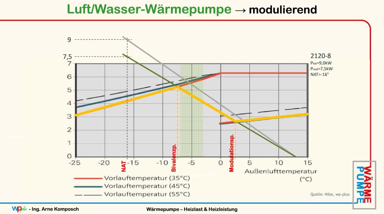 eine luftwasser-wp ist ein kompromiß. in praktisch jeder hinsicht. beispiel dimensionierung: das ist leider kein wunschkonzert, sondern ein kompromiß zwischen nicht zuviel unterdeckung bei auslegungslast und nicht zuviel leistung/takten am typischen wintertag. so schaut das bsplw im planungshandbuch von alphaInnotec aus... gebäudekennlinie=bedarf gebäude <-> leistungskurve LWWP LWWP [Luft-Wasser-Würmepumpe] heizleistung & heizlast sind der perfekte mismatch: das ist das angebots-/leistungsparadoxon 👉 je kälter desto mehr braucht das haus & desto weniger liefert die wp 👉 je wärmer desto weniger braucht das haus & desto mehr liefert die wp der kompromiß ist die grafische bivalenzauslegung, die seit jahrzehnten stand der technik ist. wenn du hier wie bei einer SWWP monovalent auslegst dann hast du am typischen wintertag bei +2° eine heizlast von 6kW aber eine leistung der wp von 19kW... hier siehst du daß der großteil des modulationspotentials zum geradeziehen dieses bedarfs-/angebotsparadoxons aufgebraucht wird. real nutzbar ist gerade ein bereich von 1:2. SWWP kommen da auf 1:5 und mehr... da sieht man wieder wie wichtig bei wärmepumpen der systemische ansatz ist. du hast eine on/off LWWP LWWP [Luft-Wasser-Würmepumpe] die kann nur vollgas kühlen. das ist viel zu viel leistung für ein wohngebäude. passive kühlung funktioniert indem leistung durch laufzeit ersetzt wird. das paßt dann perfekt zum kühlbedarf. das forum hier ist voll mit sehr sehr positiven berichten... https://www.energiesparhaus.at/forum-einstellung-passive-kuehlung-nibe-knv/42267_10 |