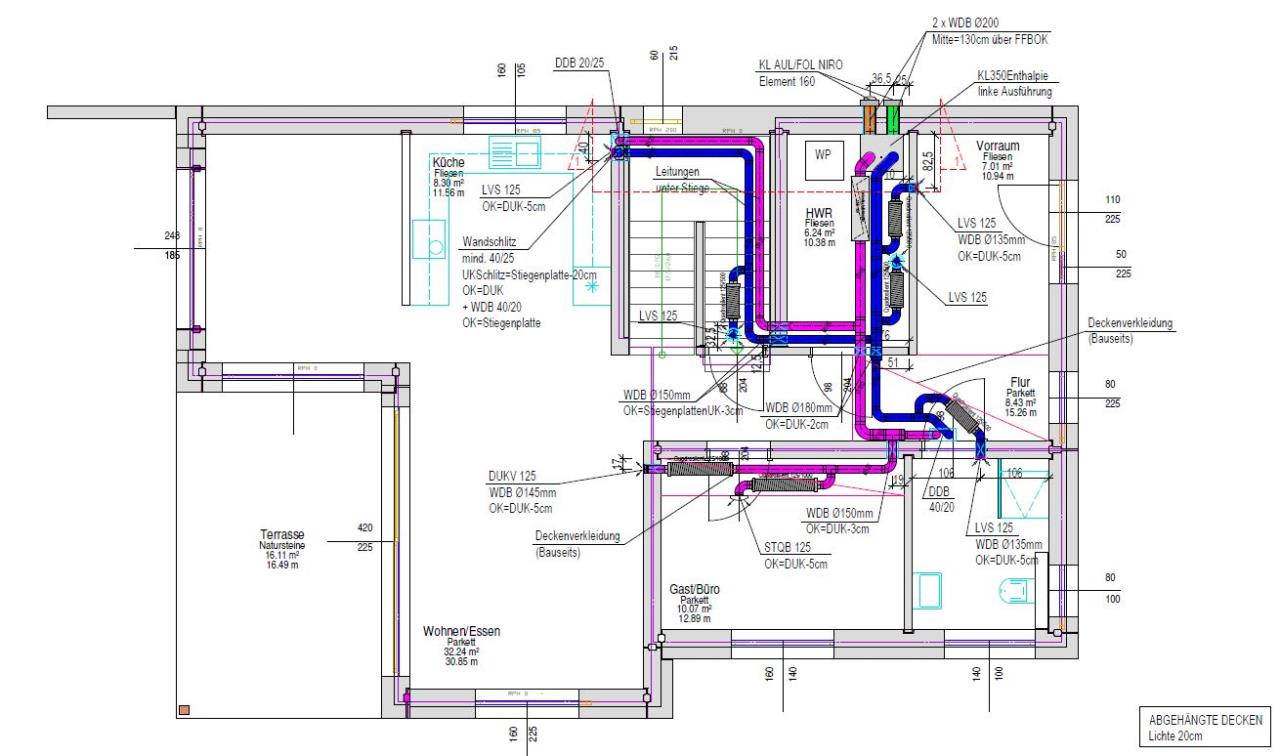 ja auf alle fälle ist das möglich. hier ein teil unseres lüftungsplanes den wir vom lüftungsbauer bekommen haben und den romberger in ihren planungen berücksichtigt hat (decken- und wanddurchbrüche, aussparungen). die montage wurde von der lüftungsfirma erledigt, die abgehängten decken haben wir an einen bekannten vergeben. insbesondere aufgrund dieses forums wollten wir unbedingt eine lüftungsplanung mit spiroverrohrung, wofür oftmals abhängungen in durchgangsräumen erforderlich sind. das stört aber überhaupt nicht, wir haben die abgehängten bereiche gleich für die installation von indirekter beleuchtung genutzt.