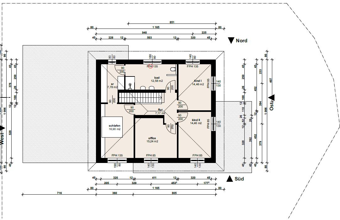 Ein engerer Verlegeabstand bringt nur bedingt mehr Leistung. Da sprechen wir bei doppelten Verlegeabstand um etwa 17% mehr Leistung/m². Hier ein Beispiel dazu: Das Bad ist der Raum mit der größten Leistungsanforderung (24°C) und mit den wenigsten verfügbaren Bodenflächen (Badewanne auf Rohboden & Duschtassen). Dazu kommt, wie auch bei deinem Grundriss, dass dies im Norden liegt - keine solaren Gewinne. Auch das Kinderzimmer daneben, welches eine Nordostecke hat, wäre nur mit einer Fußbodenheizung unterversorgt. Es hilft also nur, mehr Fläche zu aktivieren! Im Bad zusätzlich zur FBH FBH [Fußbodenheizung] und BKA BKA [Betonkernaktivierung] auch eine Wandheizung einzuplanen. Dann wird dieser Raum den gewünschten Temperaturkomfort erreichen. Ein Bad in einer Wohnung mit einem Bad in einem Haus zu vergleichen wird schwierig. Wie ist das Bad im Gesamtbaukörper eingegliedert? Es geht nicht um die Verluste innerhalb eines Gebäudes, sondern um die Verluste, die ein Raum nach außen verliert. Und da hat das Bad bei dir einen relativ hohen Außenwandanteil.