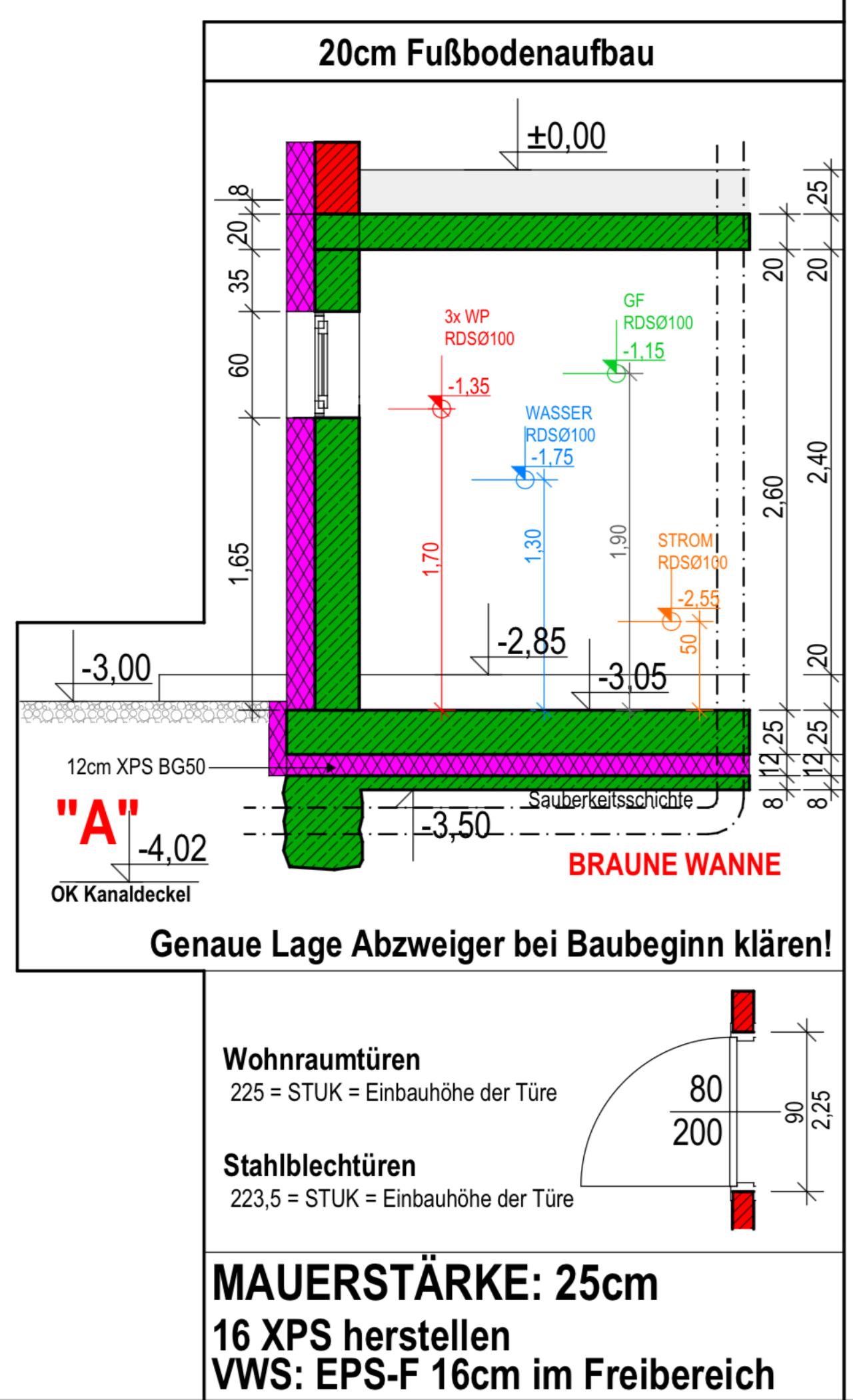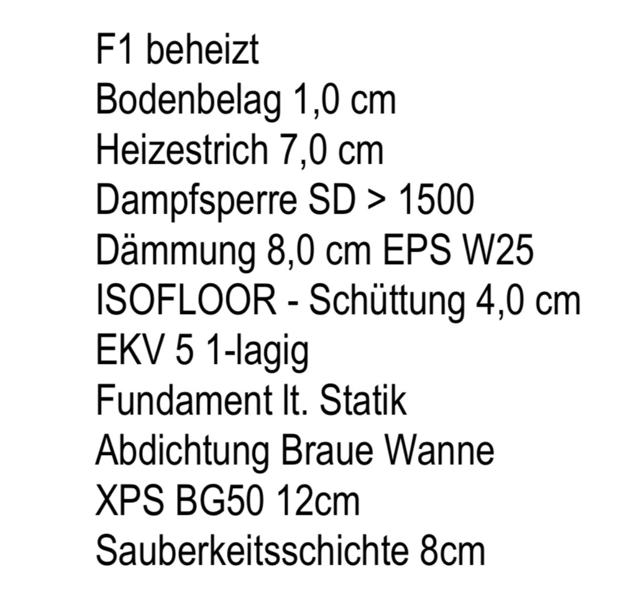 Er ist definitiv kühler, aber nicht wirklich feuchter. Es ist relativ konstant. Während es im Haus momentan 24 Grad hat, hat es im erdberührenden Teil des Kellers eher 20 Grad im Bereich der Diele. Technikraum und Lagerraum, die komplett unter der Erde sind (Lichtschacht jeweils), sind aber wärmer und eher so bei 21-23 Grad (liegt aber daran, dass der Technikraum Wärmepumpe, Speicher und Wechselrichter beherbergt). Alle Räume sind beheizt (Fußbodenheizung). Beim Hochgehen durch das Stiegenhaus merkt man richtig die sich ändernden Temperaturverhältnisse. Die Kellerwände sind außen mit 16cm XPS gedämmt und der Beton selbst wurde mit Bitumenanstrich versehen. Wenn ichs richtig im Kopf habe Aufbau innen nach außen: - Stahlbeton (25 cm) - Bitumenanstrich - Bentonitmatten - XPS 16 cm Und hier der Fußbodenaufbau: |