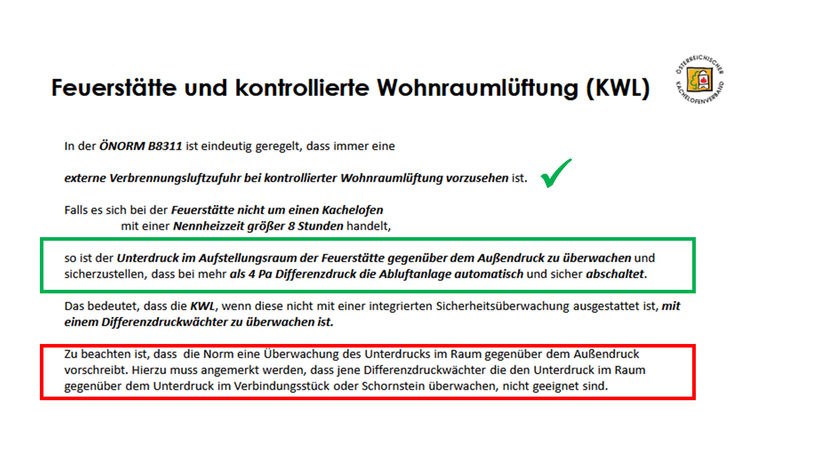 Wenn dein Rauchfangkehrer das will, dann wirst nicht darum herumkommen. Meinem Rauchfangkehrer war nur wichtig, dass ich zum raumluftabhängigen Kaminofen keine Dunstabzugshaube betreibe. Die KWL KWL [Kontrollierte Wohnraumlüftung] war ihm egal, denn es gibt durch die KWL KWL [Kontrollierte Wohnraumlüftung] ja weder Über- noch Unterdruck. |