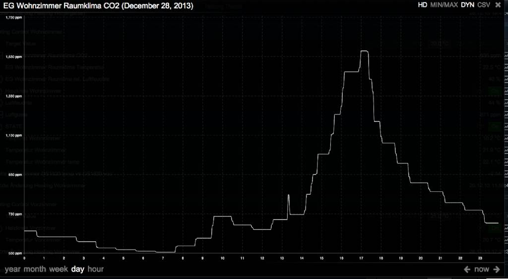 interessant! Leider tu ich mir schwer in deinem Bild die vertikale Skalierung CO2 abzulesen... kannst du das in lesbarer Qualität nochmal einstellen, und vor allem zum Vergleich auch den VOC-Wert?