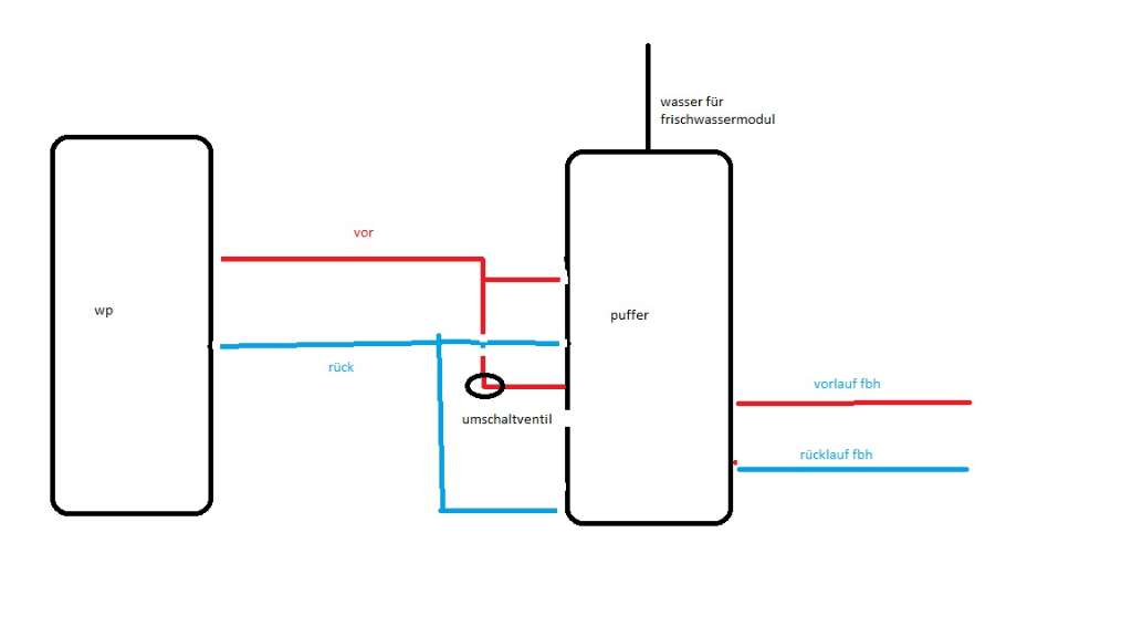 sie kann nicht nach beidem regeln, offensichtlich ist sie rl-geführt. das ist mindestens genau so gut, es müssen nur die sollwerte angepaßt werden. einer der nachteile des pufferbetriebs, daß bei hk-vl-soll 36° die wp den puffer mit über 40° laden muß - durchaus nicht unüblich. (speicherverluste, durchmischungsverluste) bei direktheizung brauchst du dann eben weniger 'temperaturüberhöhung', alles was die wp liefert, geht dann in die heizkreise... sind die hälften auch thermisch ident? dann könnte man am verbrauch des nachbarn deinen bedarf abschätzen. willst du aufstocken, oder den dachboden ausbauen?... ok, der rest ist mir aber reichlich unklar? das gelbe ist das umschaltventil (kabelanschluß)? das sitzt aber im rl, du hast es im vl gezeichnet? und der vl hat kein umschaltventil??? kannst du noch fotos vom speicher oben inkl den anschlüssen bis zu den beiden rohren von der wp (vl/rl) einstellen? arne |