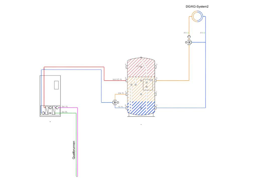 ich hab das zeichnen versucht, müßte dann bei dir so aussehen... das erscheint mir alles andere als effizient. der sinn eines kombipufferspeichers ist eine gute schichtung, dh daß das wasser je nach temperatur auf der richtigen höhe im puffer sitzt. es hat aufgrund des unterschiedlichen spezifischen gewichts eh selbst den wunsch das zu tun, allerdings muß die zufuhr und entnahme immer auf der optimalen höhe passieren. als beispiel unser hydraulikschema, ebenfalls mit kombipuffer... hier siehst du ein internes umschaltventil in der wp zw ww-vl und hz-vl. der rücklauf ist mit externem ventil wie bei dir ausgeführt. ww-laden: wp-vl geht oben auf A rein, ww-rl geht bei B raus. so kannst du gezielt den oberen bereich über der schichttrennplatte 'heiß' laden. hz-laden: wp-vl geht bei C rein, hz-rl geht bei D raus. so wird gezielt der untere bereich mit weniger heißem hz-wasser beladen. auf diese weise reduziert man strömungs- und schichtungsverluste, das wichtigste für effizienten pufferbetrieb. daß das bei dir vernüftig funktioniert kann ich mir schwer vorstellen - aber die tage dieser hydraulik bei dir sind eh gezählt...