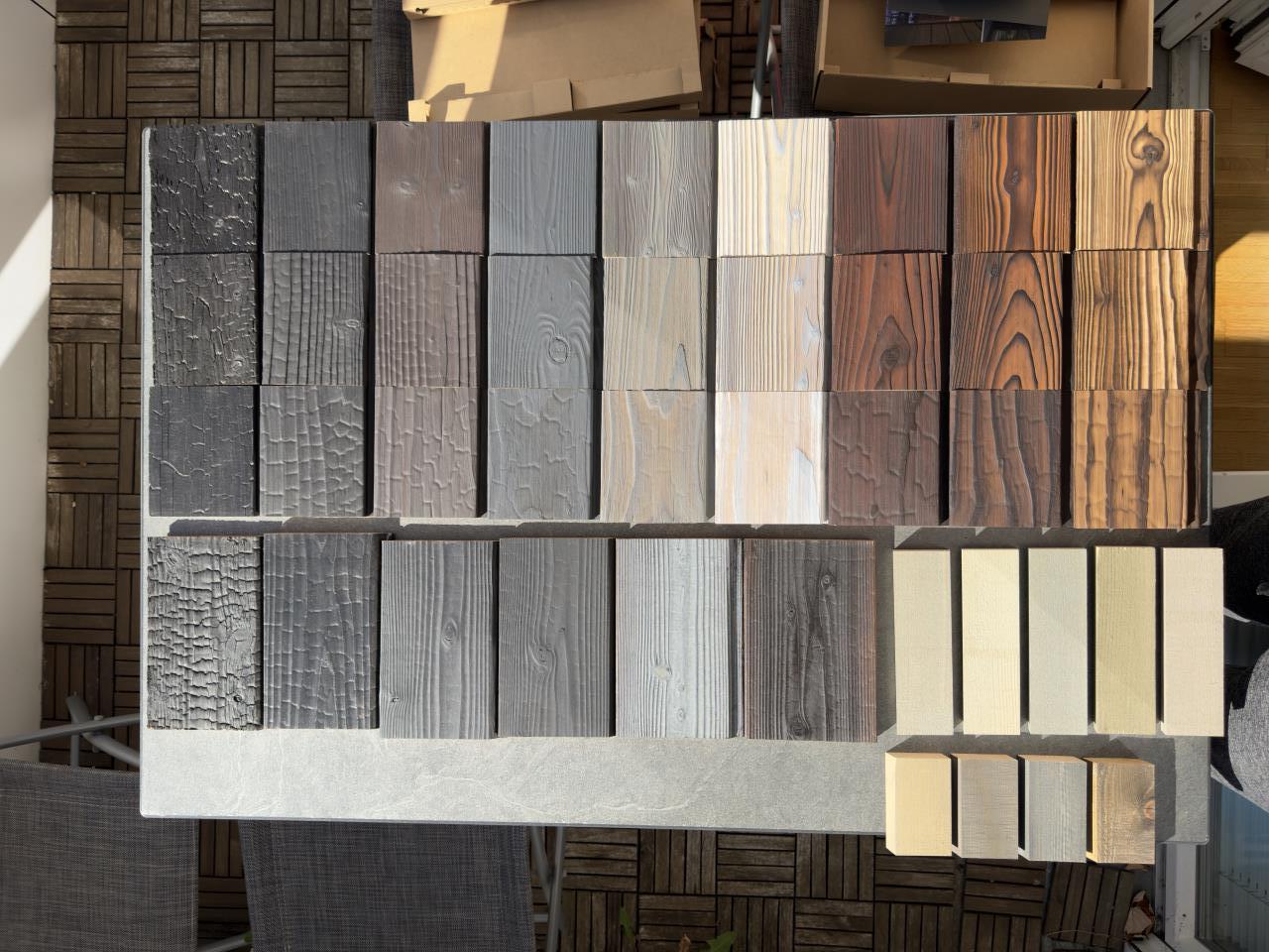 Nakamoto Forestry Deutsche Niederlassung des weltgrößten Yakisugiherstellers. Kontakt und Service per Mail, ausführliche Auskunft (vermutlich auch viel Marketinggerede). Musterbox mit gewünschten Farben wurde umgehend versendet. Sie verwenden ausschließlich japanische Zeder (Sugi) - einerseits soll das angeblich das beste Holz für Yakisugi sein (steckt ja auch im Namen), andererseits muss das Holz halt erst mal um die halbe Welt verschifft werden. Im Sinne der Nachhaltigkeit daher nicht so toll. Preislich mit rund 80-100 Euro pro m2 (abhängig von Breite und vmtl. auch Profilierung) nochmal teurer als Ennobled. Versandkosten rd. 1100 Euro für 320 m2 Holz. Im Gegensatz zu allen anderen Anbietern sind die Bretter nur 15mm stark (Konkurrenz hat um die 20mm plusminus) - was auf Nachfrage daher kommt, dass nur bis zu dieser Stärke die komplette Durcherhitzung des Brettes garantiert ist, und es dadurch resistenter gegen Fäulnis und Schädlinge wird (thermisch behandelt) - die anderen Anbieter verkohlen nur oberflächlich - laut Nakamoto. Die Muster sind von den Oberflächenfinishes sehr schön, allerdings verziehen sich alle Musterbretter auf die Breite von ca 15cm und liegen nicht plan auf, was ich nicht so überzeugend finde. Auch die Tatsache, dass es profilierte Bretter nur in der Breite von ca. 15cm und nicht schmäler gibt, ist für uns persönlich - abgesehen vom Preis - eher ein Ausschlusskriterium. Glattkante Bretter für offene Fassaden gibt es auch mit ca. 9cm Breite.