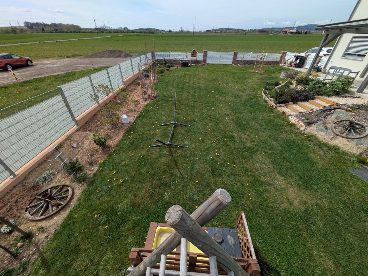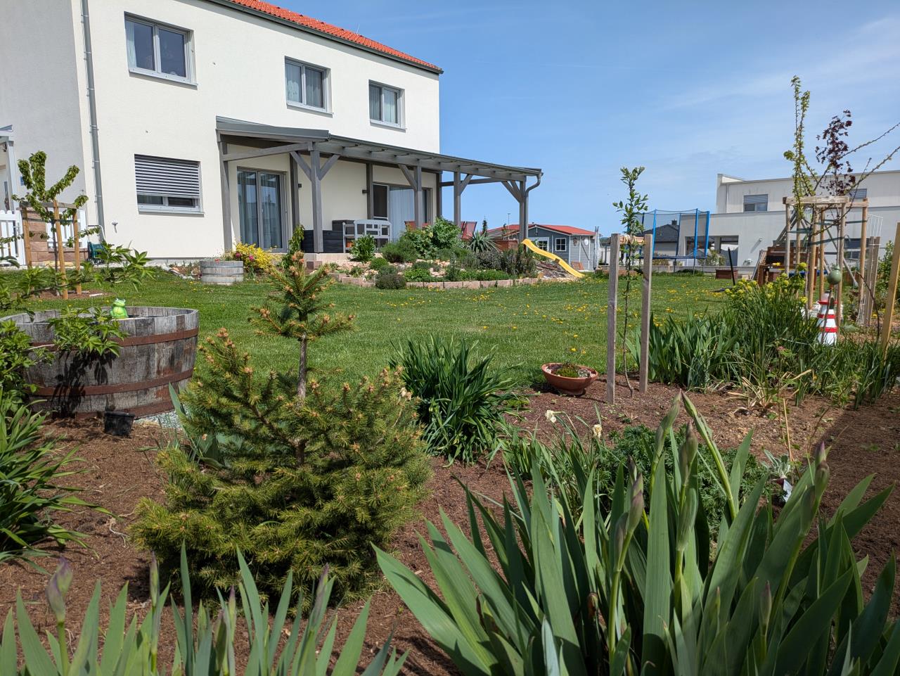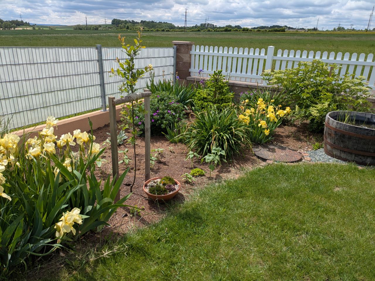 Hier mal ein Überblick nach dem Frühlingserwachen: Neu hinzugekommen bzw. erweitert wurde die wilde Mixed Border Zone. Dort haben wir die Grasnarbe entfernt (das war ein Horror zum Rasenmähen) und zusätzliche Blumen und Sträucher gepflanzt. Das wird noch die ganze Länge bis ganz hinten weitergeführt. Nachteil: dafür braucht man initial schon ordentlich viel Mulch und Häckselgut. Der Rasen wird heuer nicht gegossen, hab ich entschieden. Der Löwenzahn fühlt sich auch so wohl 😊 |