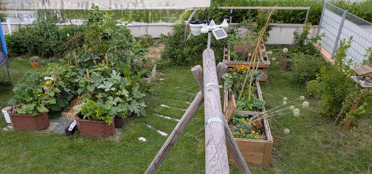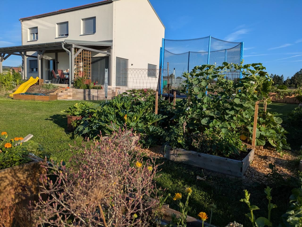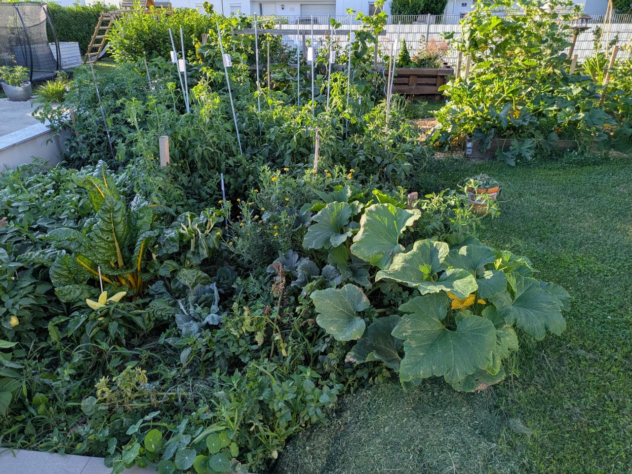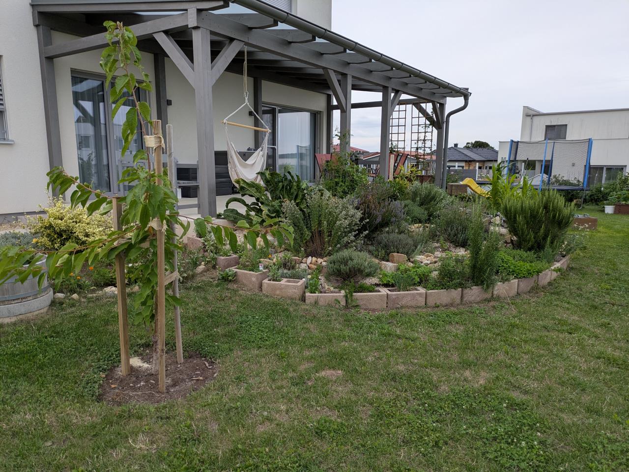 Hier mal ein Update unseres sehr unperfekten Gartens. Die Kräuter haben wir mittlerweile etwas gestutzt. Das Maggikraut ist schon über die Überdachung hinausgewachsen, also wurde es auch abgeerntet und zurückgestutzt. Und was das Kirschbäumchen im Vordergund so treibt, weiß es selbst wahrscheinlich nicht so genau... In unserer "Mixed-Border" haben sich einige Sonnenblumen selbst angebaut. Das passiert, wenn man die Blütenkörbe im Herbst als Vogelfutter auslegt... ...ein paar davon haben wir entfernt, da es zu viele zu knapp beieinander waren, der Rest hübscht wieder den Garten auf und dient jetzt schon als Vogelfutter. Wir haben sogar schon einen Stieglitz damit angelockt. In den Gemüsebeeten geht es auch schon ordentlich zu. Die Sizilianischen Schlangenkürbisse überwuchern schon brav die Bögen, die wir für sie gebaut haben. In den Hochbeeten sind einige Salate schon ausgewachsen. Wir lassen das meistens um dann die Samen zu ernten, die nächstes Jahr dann angebaut werden. ...und mit den Paradeisern (links hinten) hat es meine Frau mal wieder übertrieben. Zwiebel sind übrigens auch schon abgeernet. |