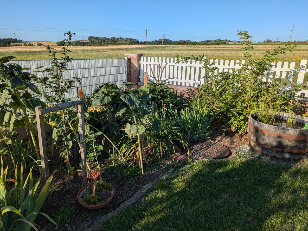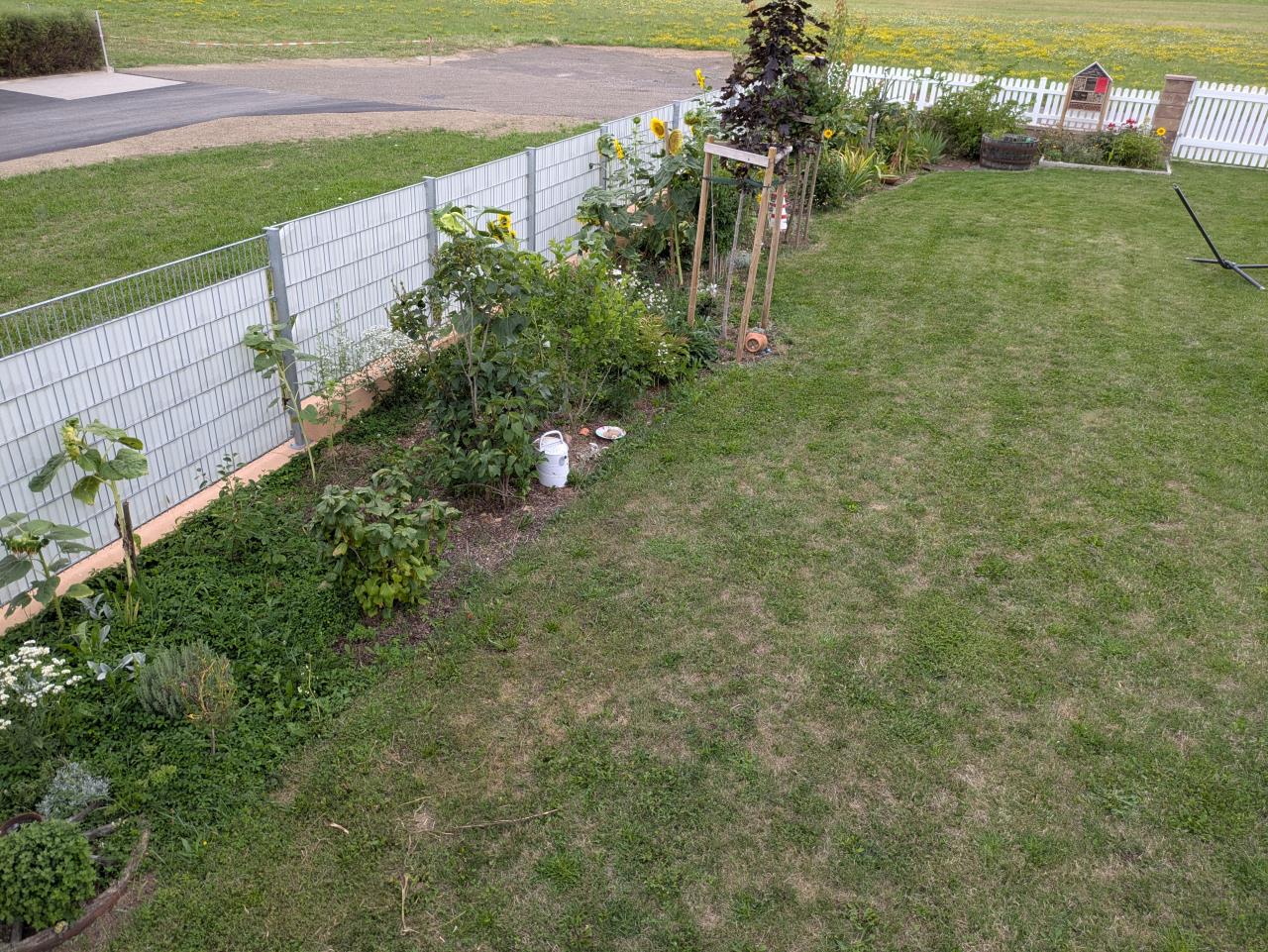 Hier sieht man das Chaos etwas besser 😂 Und weil die Morgensonne so schön war noch ein anderer Winkel. Auf der Gstettn zur Terrasse wächst übrigens Mais: In diesem Eck gehts auch ordentlich zu... Die gerettete Fichte gedeiht auch mittlwerweile recht gut, die wurde im ersten Jahr leider von einem Rehbock ordentlich gefegt. Der Hollunderstrauch rechts wächst auch unaufhaltsam. Die Sonnenblume, die sich hier so verneigt, wurde von Vögeln leergefressen, was die Schalen am Boden beweisen. Grundsätzlich gilt in unserem Garten: alles, was schöne Blüten hat, darf bleiben. |