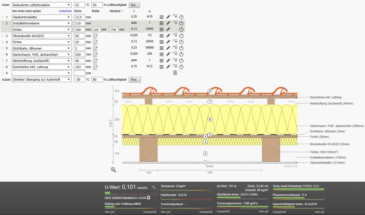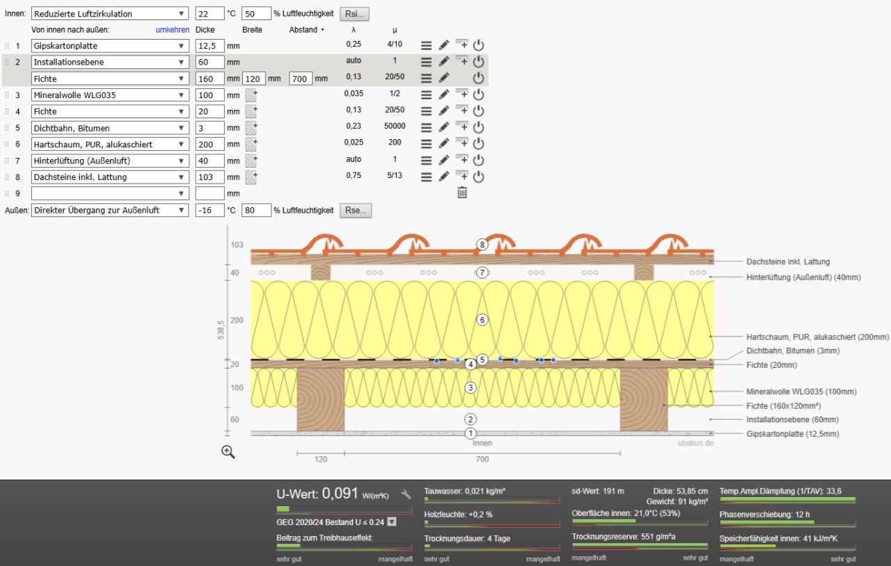 Laut Ubakus habe ich bei 5cm Steinwolle kein Kondensat im Extremfall (22° innen/-30° aussen). Bei 6cm Steinwolle bei -27°. Bei 10cm Steinwolle bei -16°.