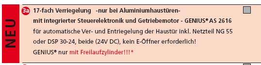 @Romeo Toscani - Sorry, aber 17fach und Motorschloss gibt es bei BW nicht ... habe alles von BW, aber da kann man entscheiden - entweder 17fach oder 5fach + Motorschloss. |