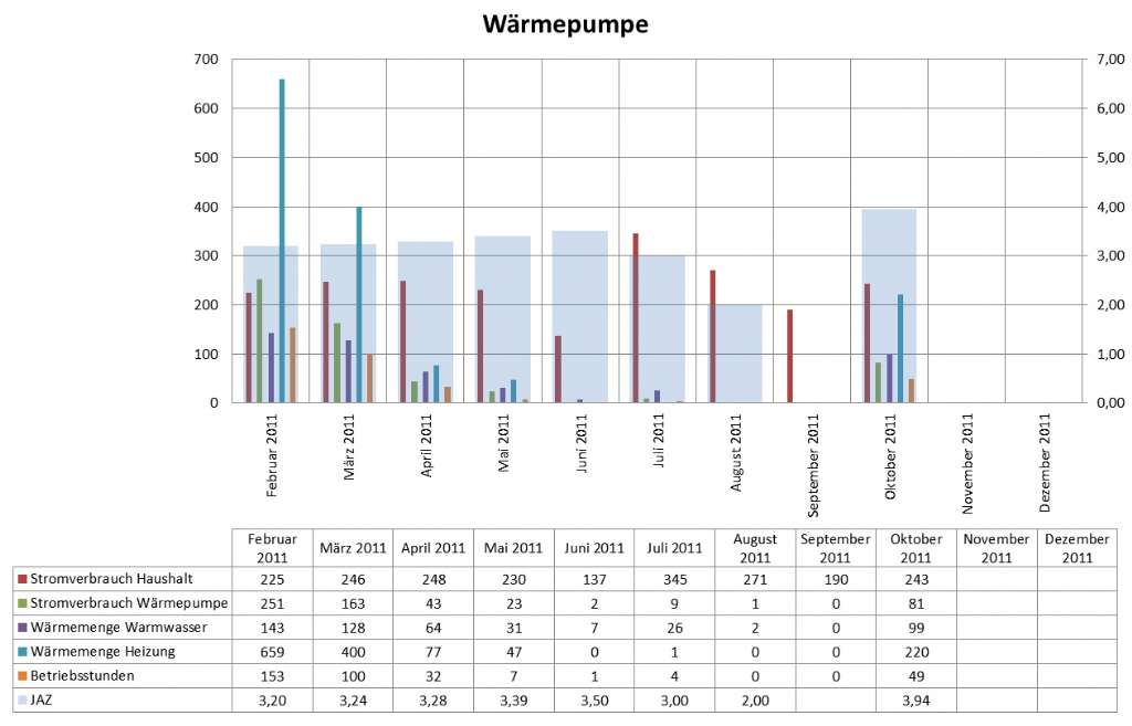 Ich habe leider erst ab Februar monatliche Aufzeichnungen über den Verbrauch gemacht - siehe Grafik: Die Fußbodenheizung hat eine eigene Pumpen-/Mischerheinheit und dort ist eine Standardheizungspumpe verbaut - die hat auf der eingestellten Stufe 2 eine Leistung von 65W. Nachdem diese immer läuft, sobald die Heizgrenze (13°) unterschritten wird, verursacht diese alleine schon Stromkosten von ca. €68,-. Eine Hocheffizienz-Heizkreispumpe wüde vergleichsweise nur €15,- Stromkosten pro Jahr verursachen. Wo könnte man ansetzen, um den Verbrauch merkbar zu senken? Nur bei der Heizkreispumpe? Die Schichtung im Pufferspeicher hätte ich auch noch in Verdacht. Eventuell mit der Wärmepumpe direkt in die Fußbodenheizung gehen? @Benji: Woran kann das Takten noch liegen? Ich denke die Wärmepumpe produziert einfach zuviel Wärme, die gar nicht so schnell in die Fußbodenheizung kann. Die 300l, die im Pufferspeicher für die Fußbodenheizung verwendet werden, werden das auch nicht groß beeinflussen, oder? Martin |