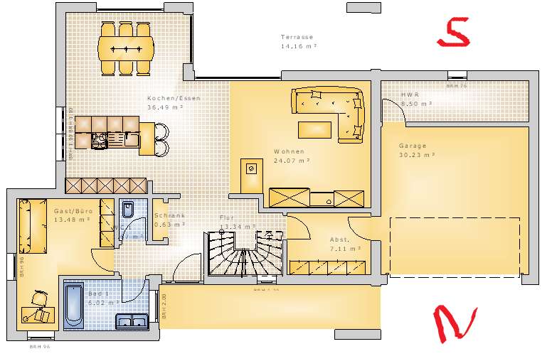 EG Eingangsbereich würde ich noch einmal überdenken. Der Eingang von der Garage ist meiner Meinung nach großzügiger als der Haupteingang. Toilette im Erdgeschoss würde ich auch nicht im Bad haben wollen. Ich finde eher das Gästebad als zu großzügig. Badewanne und 2 Waschbecken? Würde ich auf offene Dusche und 1 Waschbecken reduzieren und eventuell zusätzlich als HWR nutzen. HWR bei Garage nehme ich an wird der Technikraum, denn durch die Garage im Winter zur Waschmaschine wäre für mich weniger prickelnd außerdem der Weg zu lang. Dafür sind für mich Handwaschbecken in Toiletten ein absolutes MUSS. Würde auf jeden Fall die Mauer für Schrank im VZ weggeben, der Schrank nach der Eingangstür wird euch optisch erschlagen. Außerdem fehlt mir die Abstellmöglichkeit für Staubsauger & Co. Wohnküche finde ich nicht zu groß, wird bei uns auch ca. 60 m² bei gleicher Anordnung. Wegen der Statik denke ich auch, dass ihr noch einiges umplanen müsst. Die Stiege kommt mir auch etwas kurz und eng vor. |