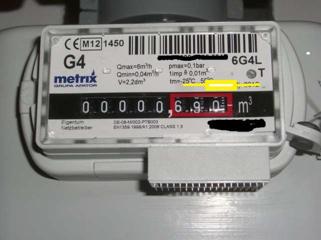 http://shop.co-met.info/artikeldetails/kategorie/zaehler/artikel/impulsnehmer-ni-3-fuer-gaszaehler-der-firma-metrix.html Außerdem habe ich noch mal mit eine Reed Kontakt experimentiert und tatsächlich einen Punkt gefunden, an dem ein empfindlicher Reed Kontakt zwischen Zählerstand 3 und 5 der letzten Zählerstelle Kontakt gibt (ich hatte den Typ KSK 1A87, z.B reichelt http://www.reichelt.de/Reedrelais-Magnete/KSK-1A87/3/index.html?;ACTION=3;LA=2;ARTICLE=6281;GROUPID=3291;artnr=KSK+1A87;SID=25UIfRgawQAfoAADkigrkbf55ccca7209b541005bc2ee28fa79e2). Größere Reed Kontakte und ein HALL Sensor funktionierten nicht. Ich habe die Position im Bild angedeutet. Jetzt kann die Messung beginnen