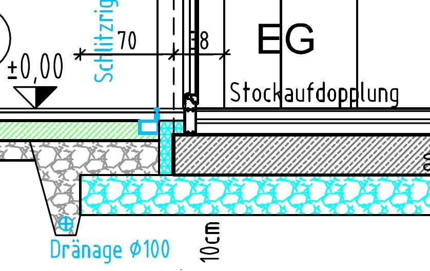 Bei Dir schauts etwas komplizierter aus - ich versuchs mal: Die Abdichtung wird zwischen Wärmedämmung und BoPla hochgezogen, ans Purenit abgedichtet. Somit schlagregendicht... dann kommt die Wärmedämmung ran, dann wird außen hinterfüllt und planiert. Herstellung der Terrassenplatte, wo gleich eine Schlitzrinne höhenrichtig versetzt wird, dann Terrassen-UK und Belag. So schauts grob umrissen aus... |